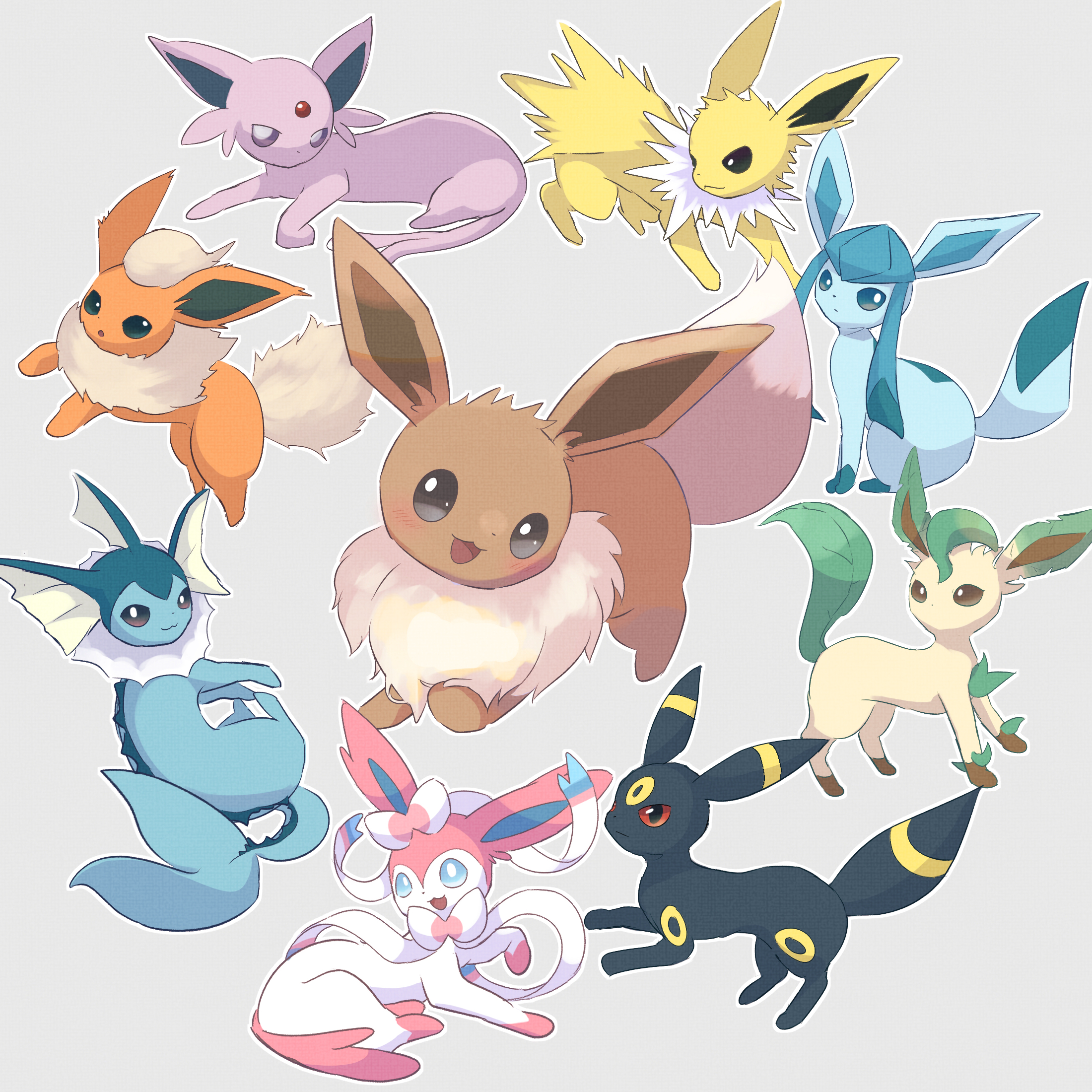 animal_focus black_eyes blue_eyes blush bright_pupils brown_eyes colored_sclera eevee espeon flareon gen_1_pokemon gen_2_pokemon gen_4_pokemon gen_6_pokemon glaceon highres jolteon leafeon nintendo no_humans open_mouth pio_(piopio_poke) pokemon pokemon_(creature) purple_eyes red_sclera simple_background smile sylveon umbreon vaporeon white_pupils