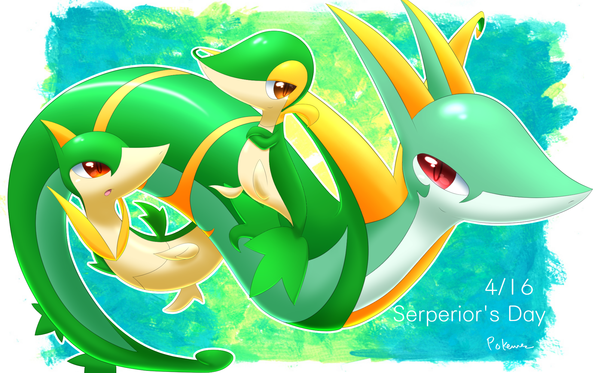 animal_focus artist_name brown_eyes closed_mouth crossed_arms dated evolutionary_line gen_5_pokemon half-closed_eyes highres nintendo no_humans open_mouth pokemer pokemon pokemon_(creature) serperior servine smile snivy