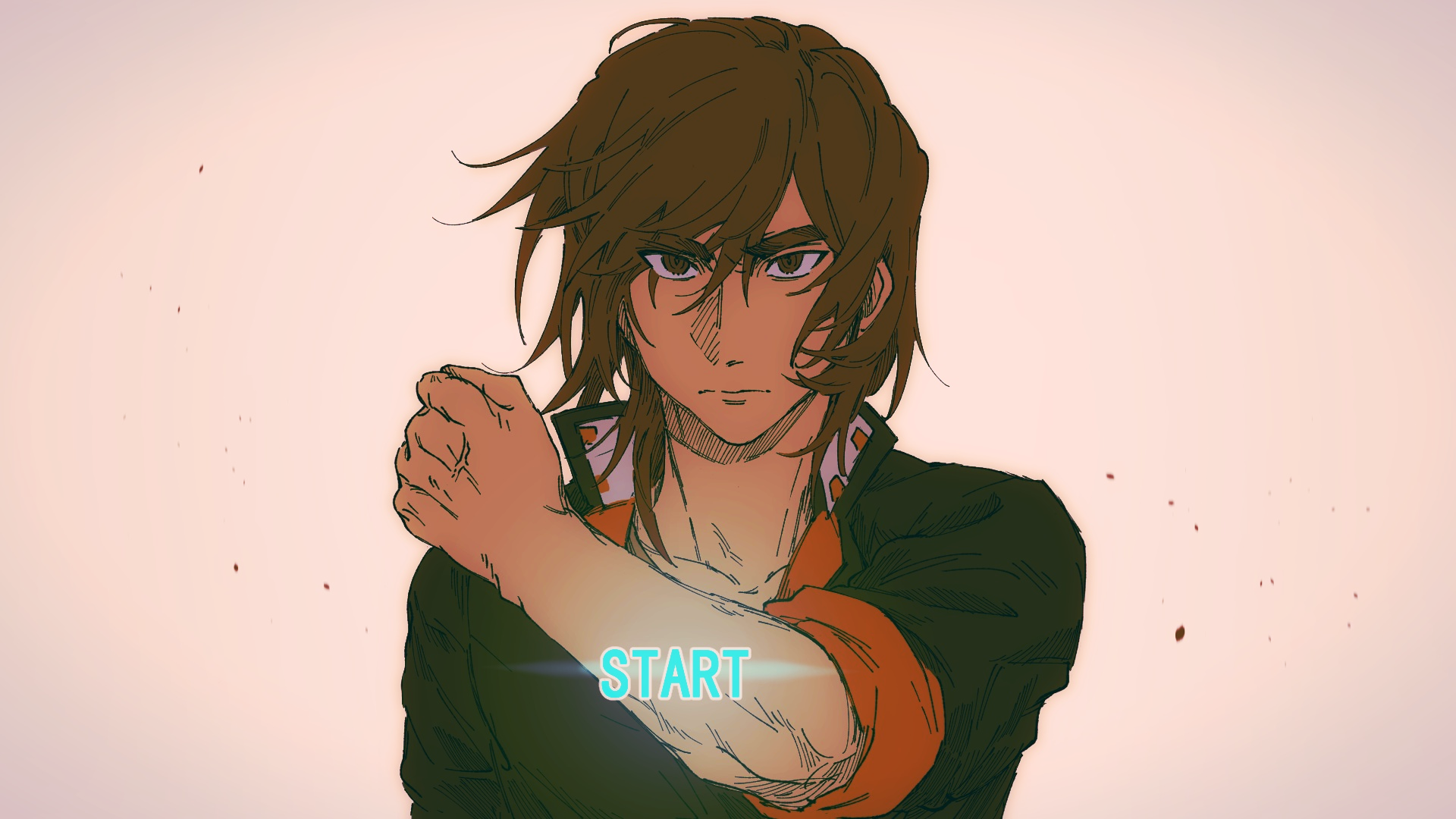 1boy brown_eyes brown_hair english_text gakuran glowing hand_up highres hijiyama_takatoshi juusan_kihei_bouei_ken looking_at_viewer male_focus school_uniform sdkafka simple_background sleeves_rolled_up solo thick_eyebrows