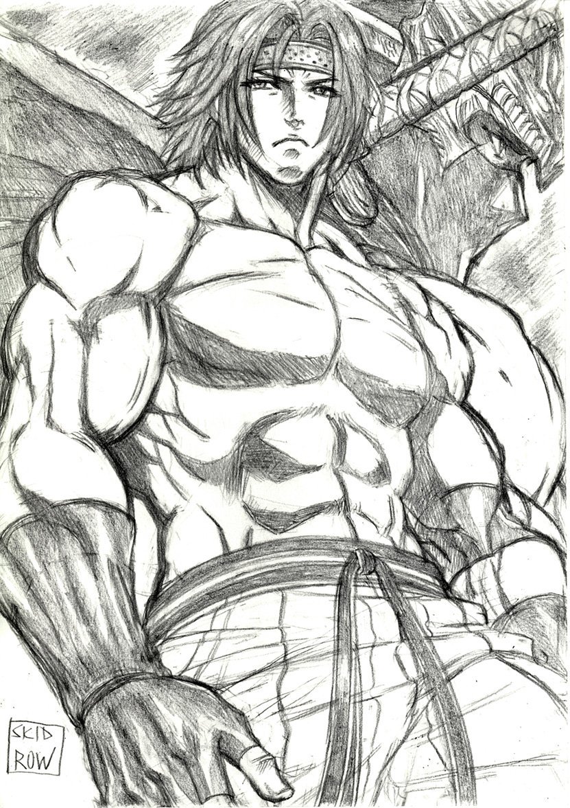 belt dead_or_alive fingerless_gloves gloves hayate_(doa) headband katana medium_hair monochrome muscular muscular_male ryu_hayabusa shirtless_male skidrow sword weapon