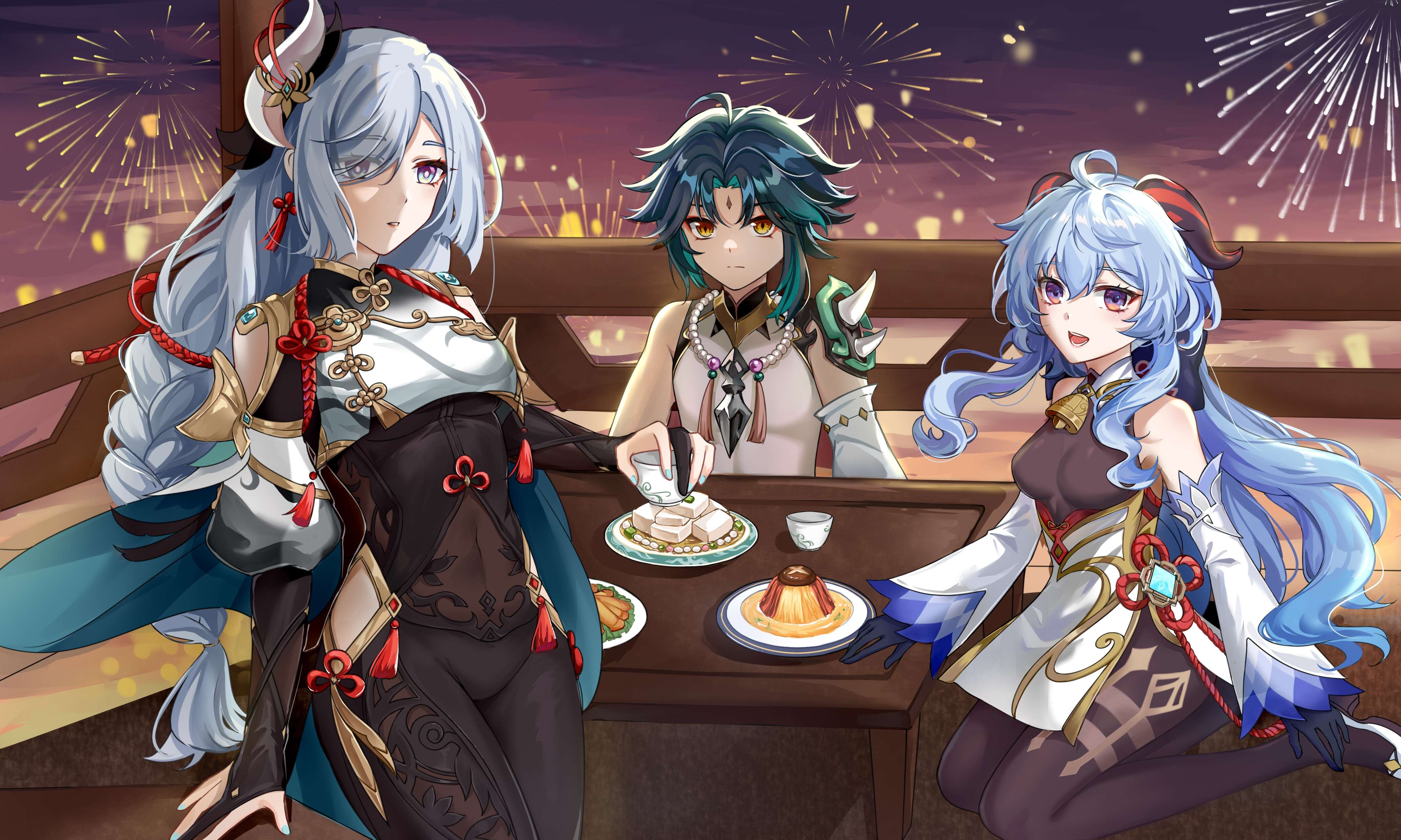 1boy 2girls absurdres aerial_fireworks ahoge almond_tofu_(genshin_impact) beads bell black_bodysuit black_gloves blue_hair bodysuit braid braided_ponytail single_breast_curtain breasts chinese_clothes clothing_cutout cup curtained_hair detached_sleeves earrings facial_mark fireworks food forehead_mark ganyu_(genshin_impact) genshin_impact gloves green_hair grey_hair hair_ornament hair_over_one_eye highres hip_vent horns jewelry lantern long_hair looking_at_viewer low-braided_long_hair low-tied_long_hair multiple_girls neck_bell necklace night paper_lantern plate purple_eyes shenhe_(genshin_impact) sidelocks sitting sky_lantern smile standing tassel tassel_earrings tofu white_hair xiao_(genshin_impact) xuan_xuan_xuan_za