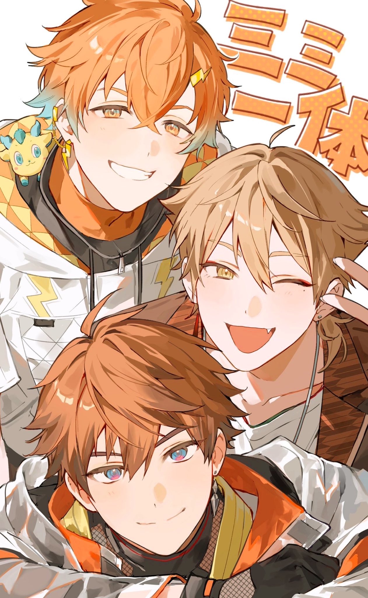 3boys ;d ahoge antenna_hair aqua_hair black_gloves blue_eyes blush brown_eyes brown_hair brown_jacket closed_mouth crossed_bangs drawstring earclip earrings eyeshadow fang fushimi_gaku fushimi_gaku_(1st_costume) gloves gradient_hair grey_jacket grin hair_between_eyes hair_ornament hand_up hashtag-only_commentary highres jacket jewelry kitami_yusei kitami_yusei_(1st_costume) lapels lightning_bolt lightning_bolt_earrings lightning_bolt_hair_ornament lightning_bolt_symbol long_sleeves looking_at_viewer low_ponytail makeup male_focus meta_(meta_91) mole mole_under_eye multicolored_eyes multicolored_hair multiple_boys necklace nijisanji one_eye_closed open_mouth orange_eyes orange_hair orange_shirt pink_eyes ponytail red_eyeshadow shirt short_hair short_ponytail simple_background single_earring smile split_mouth teeth turtleneck upper_body usami_rito usami_rito_(1st_costume) v virtual_youtuber white_background white_jacket white_shirt yagasuri zipper_pull_tab