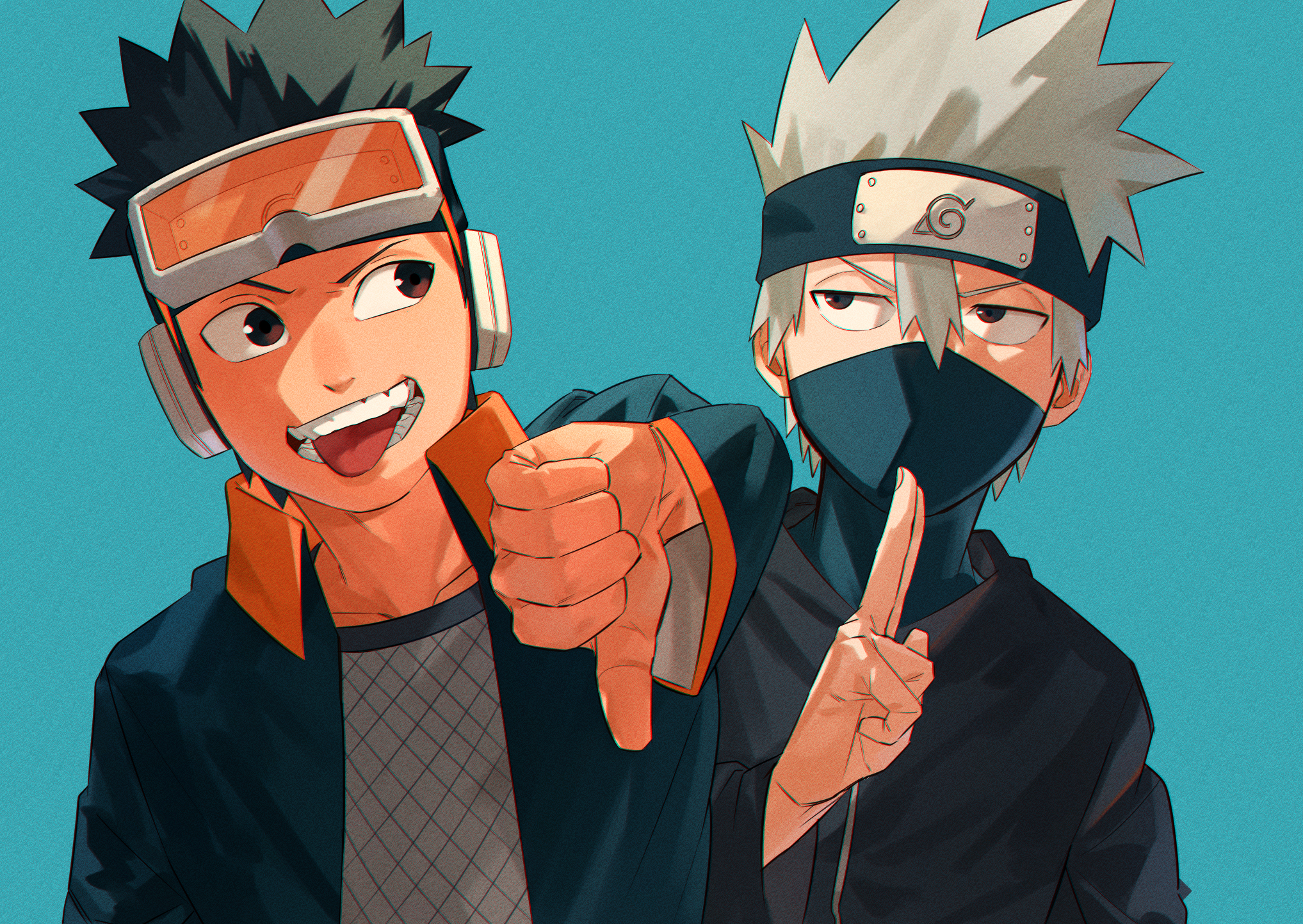 2boys black_eyes black_hair black_jacket blue_background blue_jacket brown_eyes covered_mouth fishnet_top fishnets forehead_protector goggles goggles_on_head grey_hair hatake_kakashi highres jacket konohagakure_symbol kuji-in looking_at_another male_focus mask mirin_(coene65) mouth_mask multiple_boys naruto_(series) naruto_shippuuden ninja_mask open_clothes open_jacket open_mouth simple_background spiked_hair thumbs_down tongue tongue_out uchiha_obito
