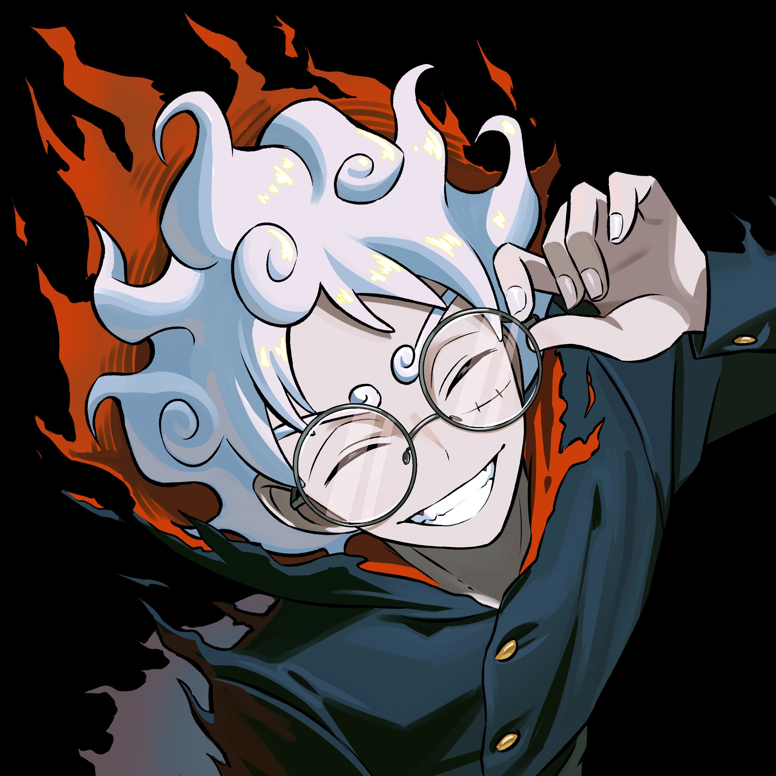 absurdres alternate_form black_background closed_eyes dandadan fusion gear_fifth glasses grin highres looking_at_viewer monkey_d._luffy one_piece scar scar_on_face school_uniform short_hair smile takakura_ken_(dandadan) takakura_ken_(transformed)_(dandadan) torn_clothes transformation white_hair zeon_(zzeeonn)