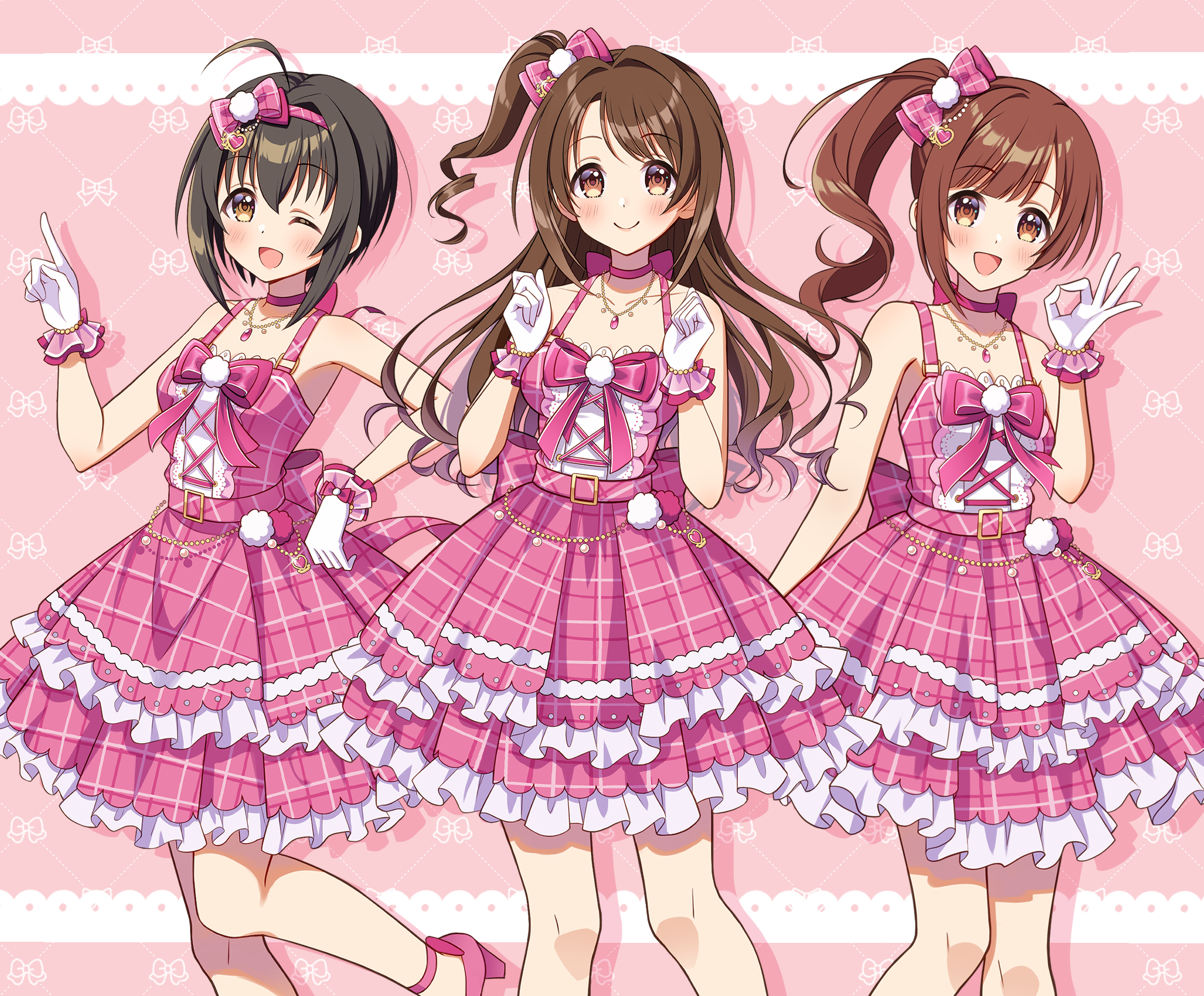 3girls :d ;d ahoge bare_legs belt black_hair blush bow bow_hairband brown_hair commentary feet_out_of_frame gloves hair_bow hairband hibiki_tohru highres idolmaster idolmaster_cinderella_girls igarashi_kyoko jewelry kohinata_miho layered_skirt long_hair multiple_girls necklace ok_sign one_eye_closed one_side_up open_mouth pink_bow pink_check_school_(idolmaster) pink_shirt pink_skirt plaid_clothes plaid_skirt shimamura_uzuki shirt short_hair side_ponytail skirt sleeveless sleeveless_shirt smile untranslatable_commentary white_gloves