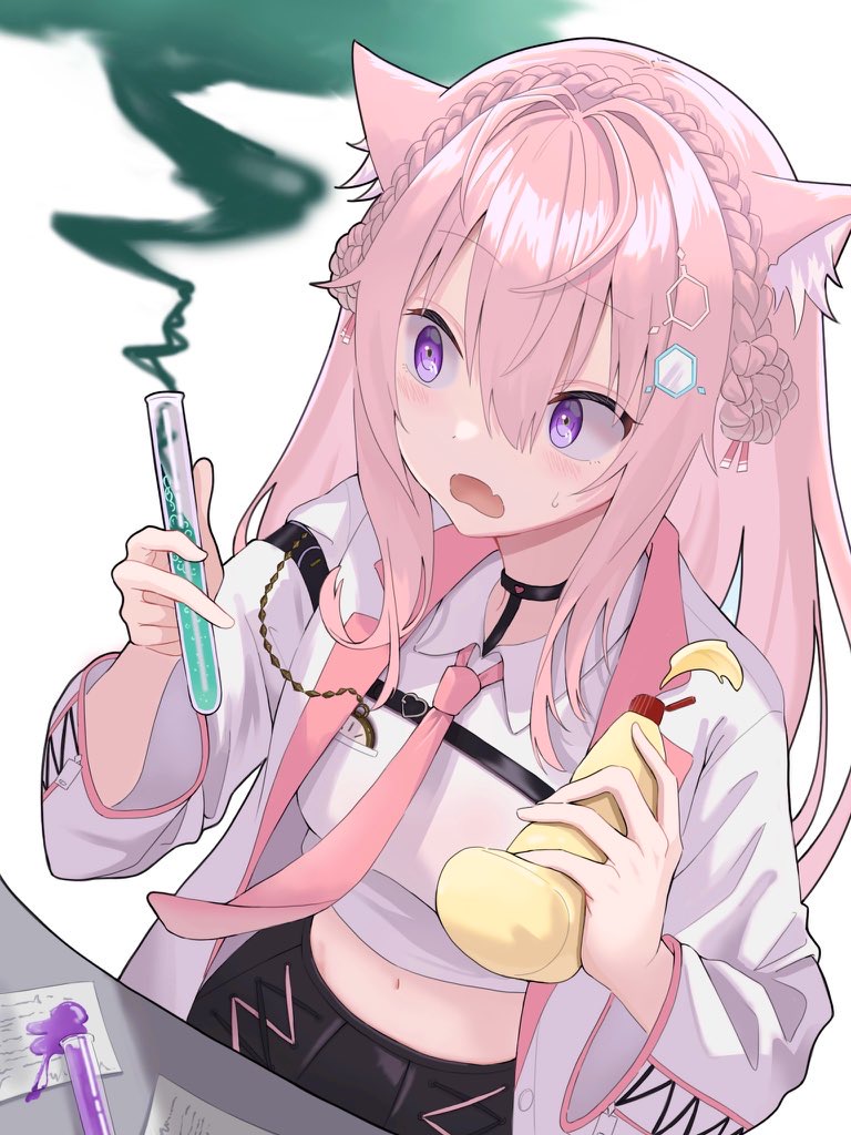 1girl animal_ears collared_shirt crop_top fang hair_ornament hakui_koyori hakui_koyori_(1st_costume) holding holding_test_tube hololive jacket light_blush mayonnaise mayonnaise_bottle melomelo2468 navel necktie open_mouth pink_hair pink_necktie purple_eyes shirt skin_fang solo sweatdrop test_tube virtual_youtuber white_background white_jacket white_shirt wolf_ears wolf_girl