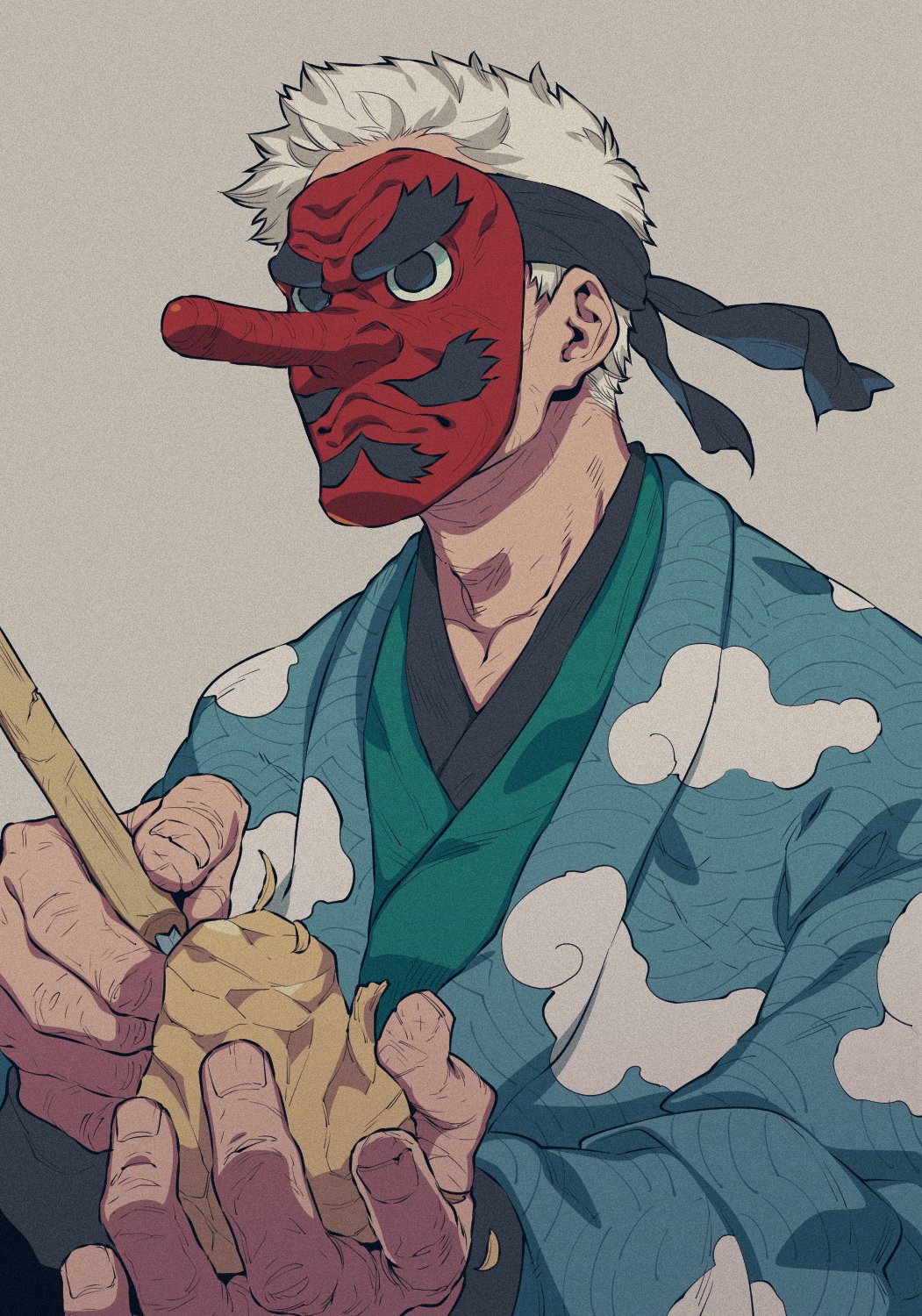 1boy blue_kimono cloud_print collarbone commentary_request from_side grey_background highres holding japanese_clothes kimetsu_no_yaiba kimono layered_clothes long_sleeves male_focus mask norasame_(dagako) old old_man print_kimono red_mask short_hair simple_background solo tengu_mask upper_body urokodaki_sakonji very_short_hair white_hair yukata