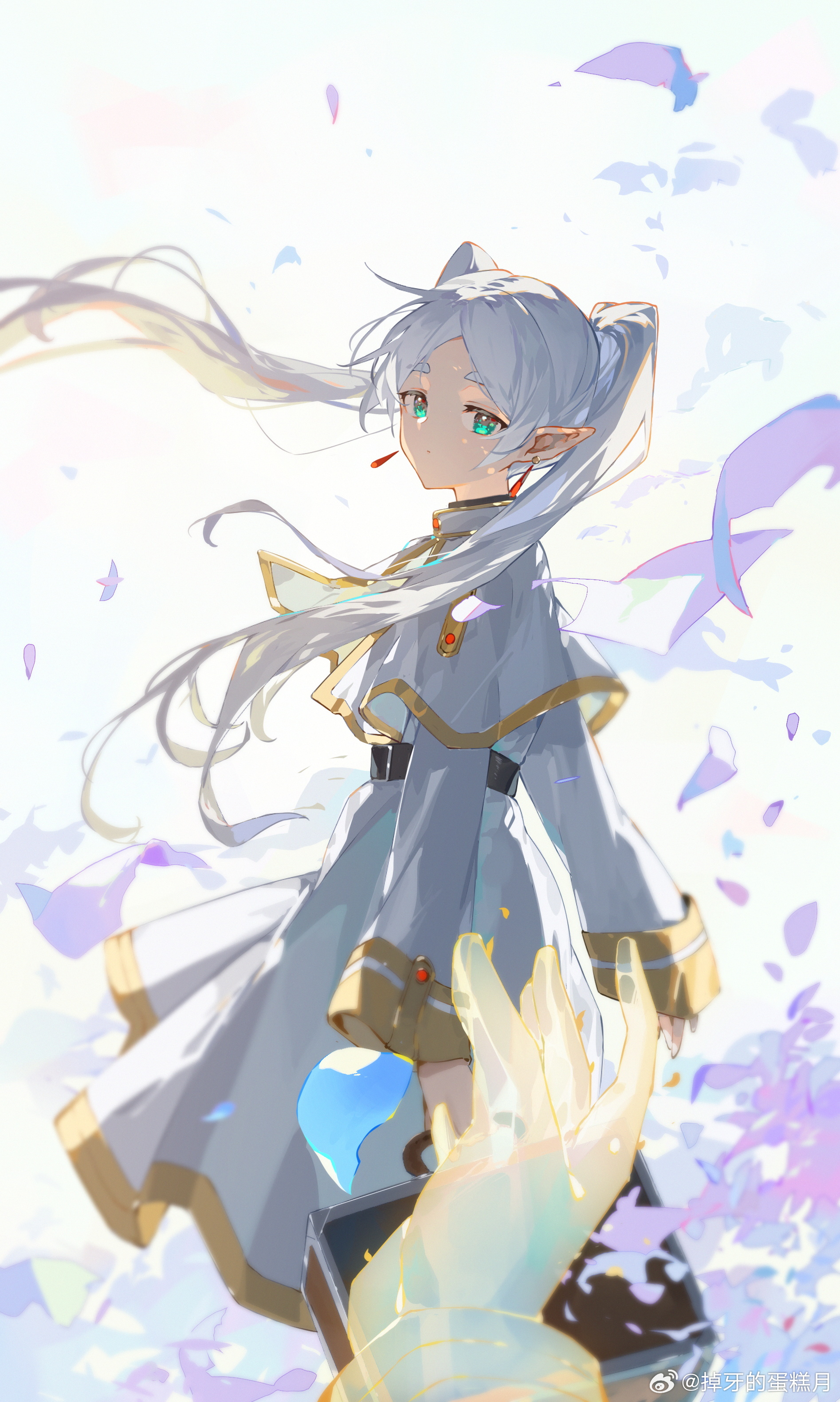 1girl 1other absurdres artist_name blue_flower capelet chinese_commentary closed_mouth commentary_request diaoyadedangaoyue dot_mouth dress earrings elf flower frieren gold_trim grey_eyes highres holding_suit jewelry long_hair long_sleeves looking_back out_of_frame outstretched_hand parted_bangs petals pointy_ears pov solo sousou_no_frieren thick_eyebrows twintails watermark weibo_watermark white_capelet white_dress white_hair wind