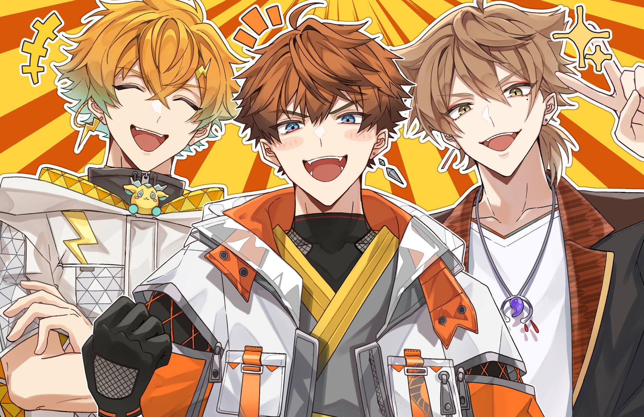 +++ 3boys :d ^_^ ahoge aqua_hair black_gloves black_jacket black_shirt blue_eyes blush blush_stickers brown_hair clenched_hand closed_eyes commentary_request covered_collarbone crossed_arms crossed_bangs drawstring earrings eyeshadow fushimi_gaku fushimi_gaku_(1st_costume) gloves gradient_hair grey_jacket grey_shirt hair_between_eyes hair_ornament hand_up highres jacket jewelry kitami_yusei kitami_yusei_(1st_costume) lapels lightning_bolt lightning_bolt_earrings lightning_bolt_hair_ornament lightning_bolt_symbol looking_at_viewer low_ponytail magatama magatama_necklace makeup male_focus mole mole_under_eye multicolored_hair multiple_boys necklace nijisanji open_clothes open_jacket open_mouth orange_background orange_hair outline pocket ponytail red_eyeshadow shirt short_hair short_sleeves simple_background single_earring smile sparkle sunburst sunburst_background teeth turtleneck upper_body usami_rito usami_rito_(1st_costume) v v-shaped_eyebrows virtual_youtuber white_jacket white_outline white_shirt yagasuri yellow_background yellow_eyes yuruo_(u_ru_o) zipper zipper_pull_tab