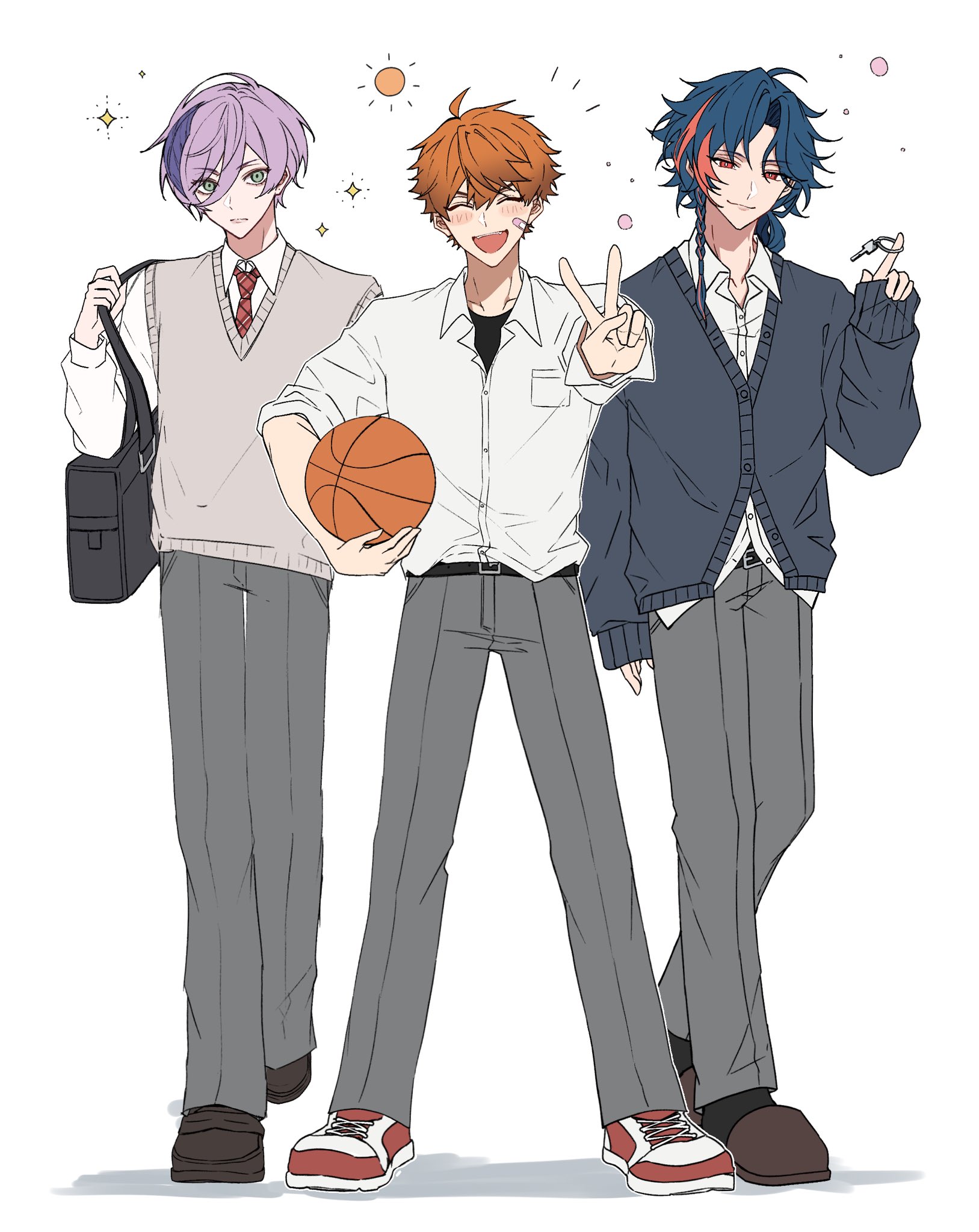 3boys 3skm_(nijisanji) :3 :d ^_^ ahoge bag ball bandaid bandaid_on_cheek bandaid_on_face basketball_(object) belt belt_buckle black_bag black_belt black_shirt blue_cardigan blue_hair blush braid breast_pocket brown_footwear buckle buttons cardigan closed_eyes closed_mouth collared_shirt commentary_request expressionless green_eyes grey_pants grey_sweater_vest hair_between_eyes hand_up highres holding holding_ball kaisei_(nijisanji) key keyring kitami_yusei long_sleeves looking_at_viewer male_focus medium_hair multicolored_footwear multicolored_hair multiple_boys necktie nijisanji notice_lines open_mouth orange_hair outstretched_arm pants parted_bangs plaid_clothes plaid_necktie pocket purple_hair red_eyes red_footwear red_hair red_necktie sakaki_ness school_bag school_uniform shirt shirt_tucked_in shoes short_hair shoulder_bag side_braid simple_background single_braid sleeves_past_wrists sleeves_rolled_up smile sneakers sparkle standing streaked_hair sun_symbol sweater_vest swept_bangs teeth undershirt untucked_shirt upper_teeth_only v virtual_youtuber white_background white_footwear white_shirt yuruo_(u_ru_o)