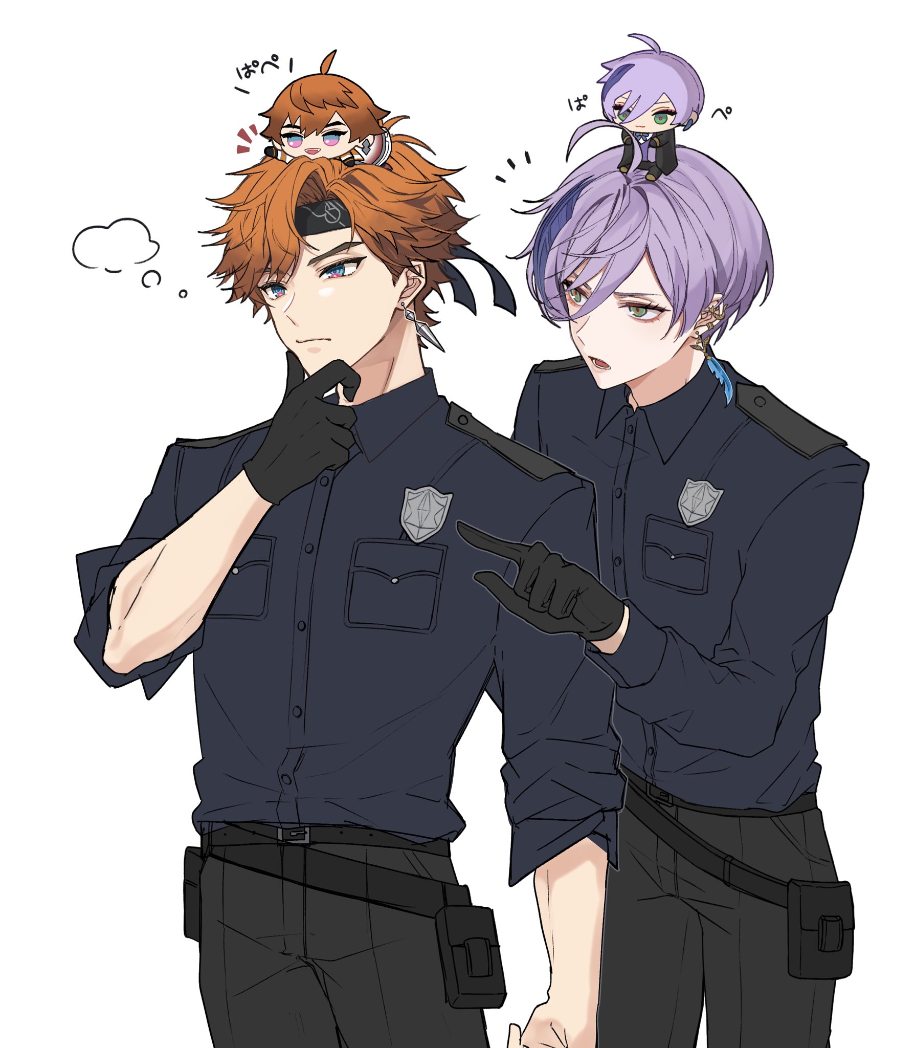 4boys ahoge badge belt belt_buckle belt_pouch black_belt black_gloves black_headband blue_eyes blue_shirt buckle closed_mouth collared_shirt commentary_request cowboy_shot earrings feather_earrings feathers gloves green_eyes grey_pants hair_between_eyes hand_on_own_chin hand_up headband highres jewelry kitami_yusei long_sleeves lower_teeth_only male_focus mini_person miniboy multicolored_eyes multicolored_hair multiple_boys nijisanji notice_lines on_head open_mouth orange_hair pants parted_bangs pink_eyes pocket pointing police police_badge police_uniform policeman pouch purple_hair sakaki_ness shirt short_hair simple_background single_earring single_glove sleeves_rolled_up speech_bubble standing streaked_hair swept_bangs teeth thinking thought_bubble v-shaped_eyebrows virtual_youtuber white_background wing_collar yuruo_(u_ru_o)
