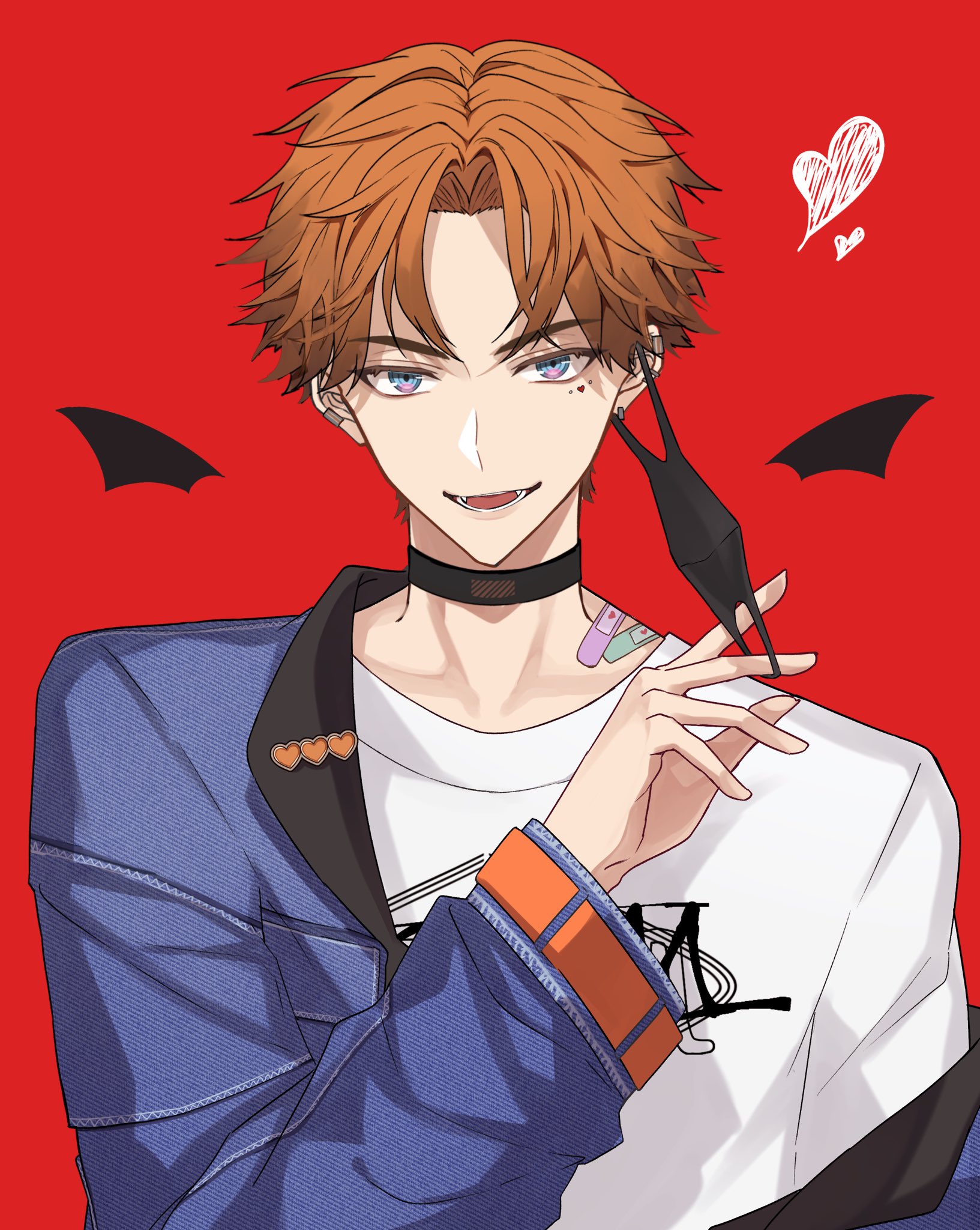 1boy :d bandaid bandaid_on_neck black_choker black_mask blue_eyes blue_jacket choker clothes_writing commentary_request ear_piercing earrings fangs heart highres jacket jewelry kitami_yusei kitami_yusei_(2nd_costume) long_sleeves looking_at_viewer male_focus mask mask_pull mouth_mask multicolored_eyes nijisanji off_shoulder official_alternate_costume open_clothes open_jacket open_mouth orange_hair parted_bangs piercing pink_eyes print_shirt red_background shirt short_hair simple_background smile solo teeth unworn_mask upper_body virtual_youtuber white_shirt yuruo_(u_ru_o)