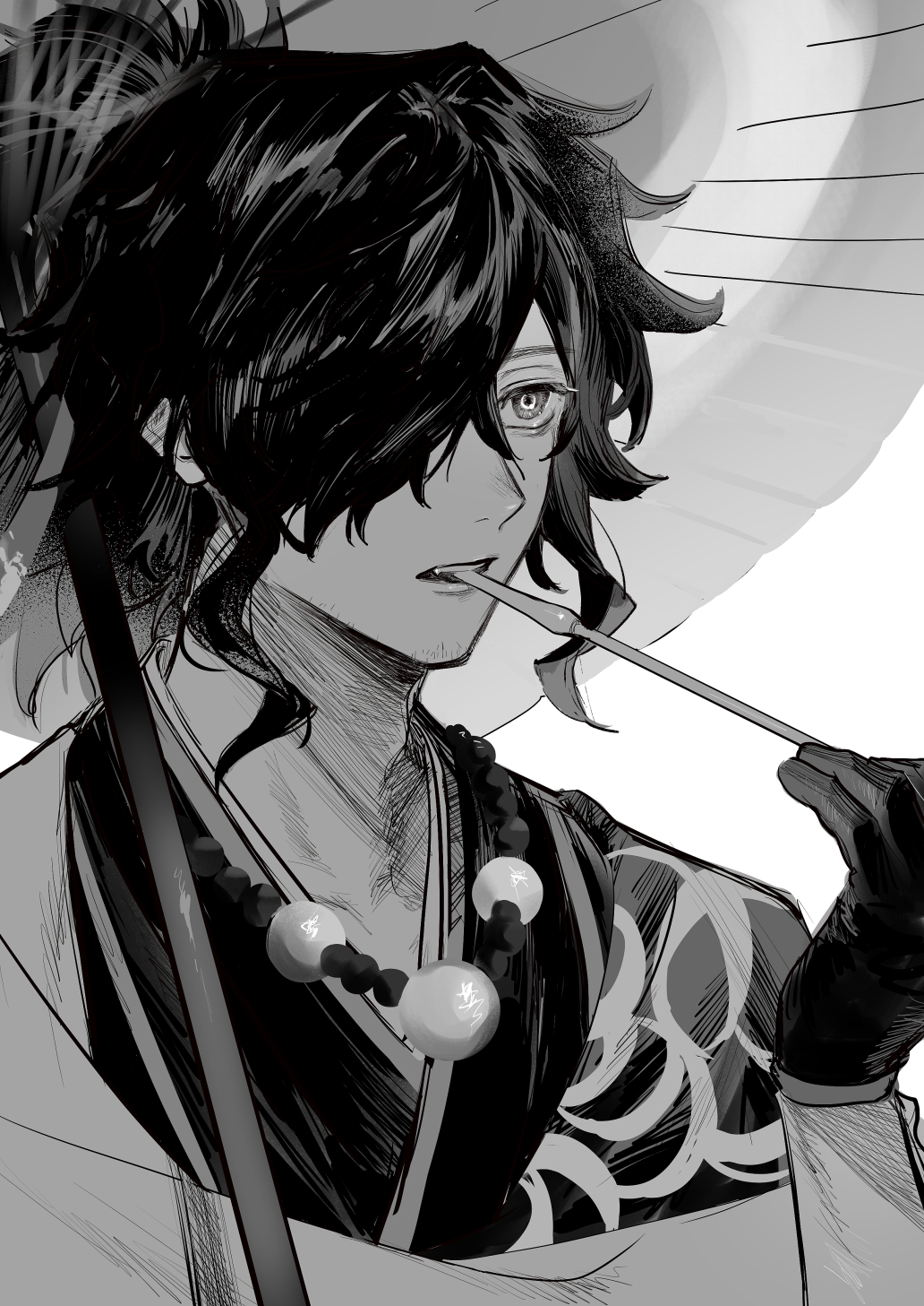 1boy bags_under_eyes chago_(aruchagos7180) fate/grand_order fate_(series) gloves greyscale hair_over_one_eye highres holding holding_smoking_pipe japanese_clothes jewelry kiseru looking_ahead male_focus messy_hair monochrome necklace oil-paper_umbrella okada_izou_(fate) smoking_pipe solo umbrella upper_body