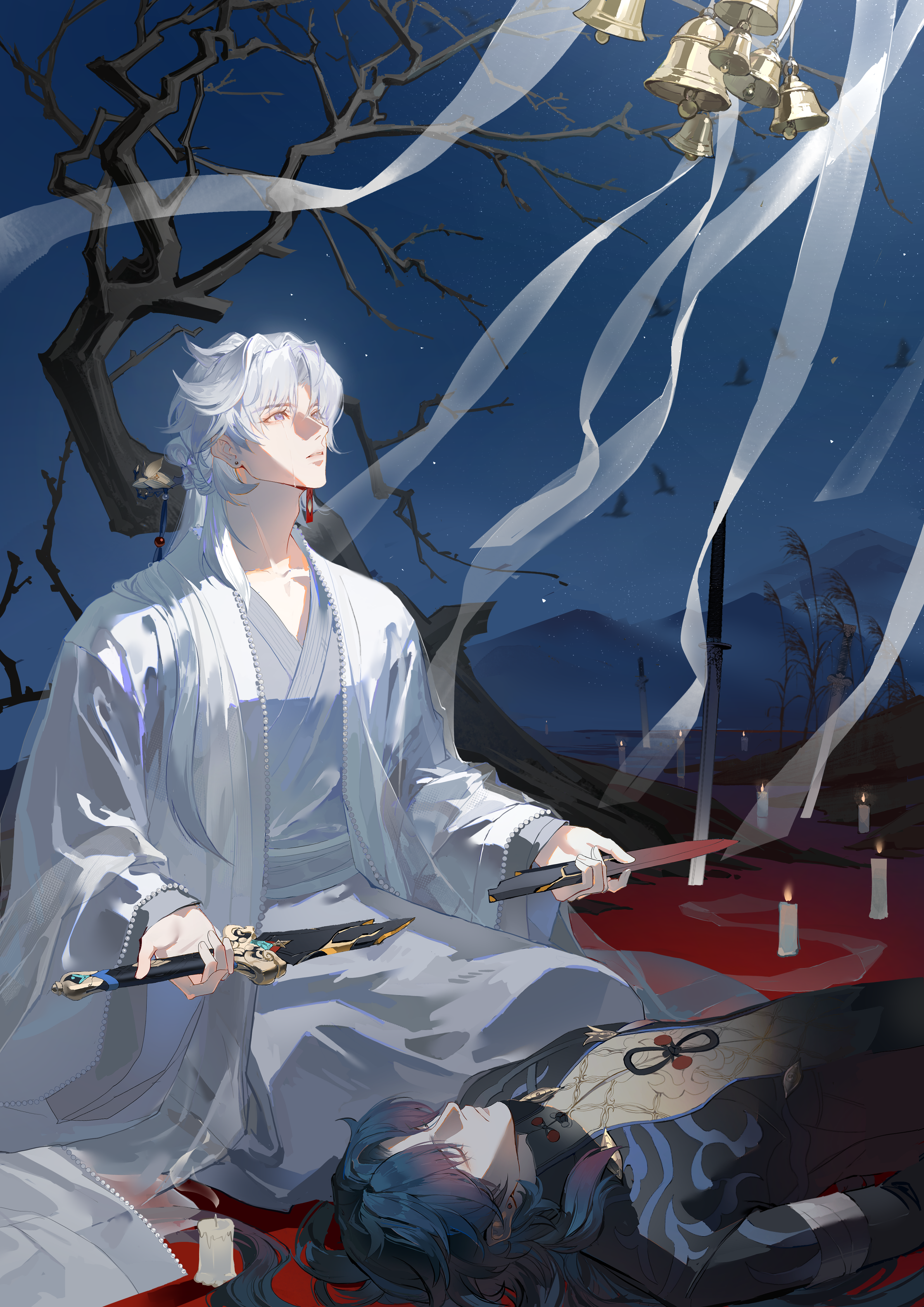 2boys absurdres alternate_costume alternate_hairstyle bare_tree bell bird bishounen blade_(honkai:_star_rail) blue_hair branch broken broken_sword broken_weapon candle chinese_clothes closed_eyes closed_mouth curtained_hair duijin_ruqun earrings guaisanmu hanfu highres holding holding_sword holding_weapon honkai:_star_rail honkai_(series) jewelry jiaoling_ruqun long_hair lying male_focus mountain multiple_boys night on_back planted planted_sword planted_weapon purple_eyes reeds robe sitting sky star_(sky) sword tassel tree weapon white_hair white_robe yingxing_(honkai:_star_rail)