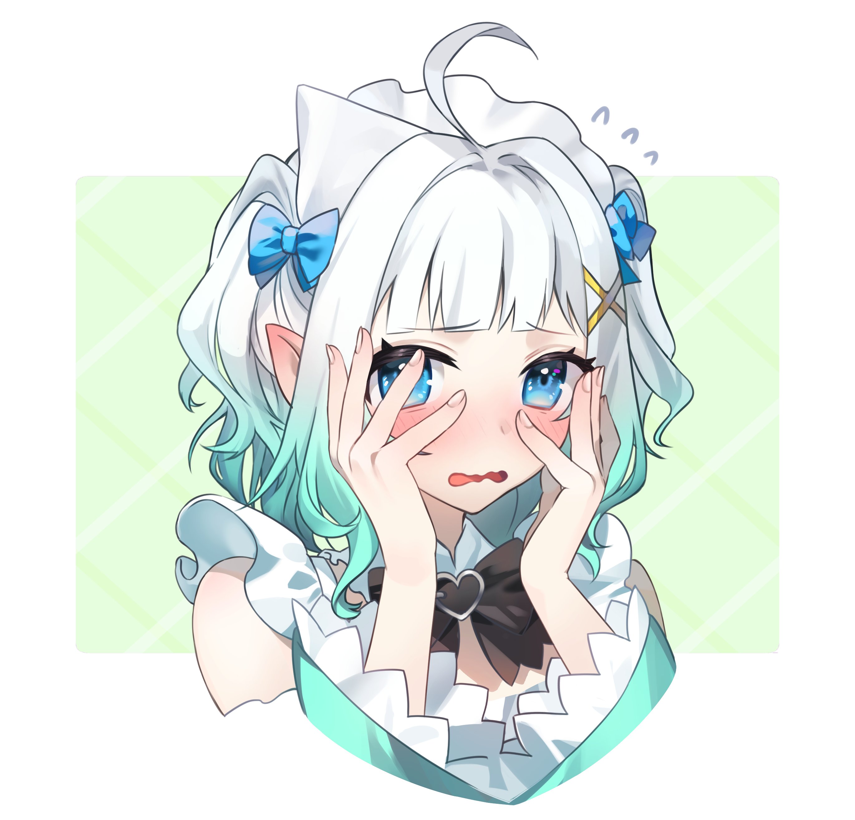 1girl absurdres ahoge black_bow blue_bow blue_eyes blush border bow detached_collar detached_sleeves dress ear_blush flying_sweatdrops ghost gradient_hair green_background green_dress green_hair hair_bow hair_intakes hair_ornament hands_on_own_face highres indie_virtual_youtuber jonillust long_sleeves looking_at_viewer maid maid_headdress mint_fantome mint_fantome_(minto_2.0) multicolored_hair open_mouth pointy_ears sidelocks simple_background solo virtual_youtuber wavy_mouth white_border white_hair x_hair_ornament