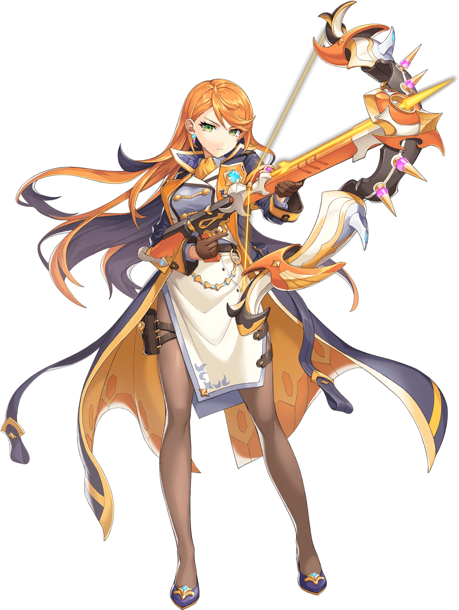 1girl artist_request bow_(weapon) breasts closed_mouth collar crossbow earrings full_body green_eyes highres holding holding_crossbow holding_weapon jacket jewelry legend_clover long_hair master_moebius multicolored_hair official_art open_clothes open_jacket orange_hair pantyhose shoes solo third-party_source transparent_background weapon