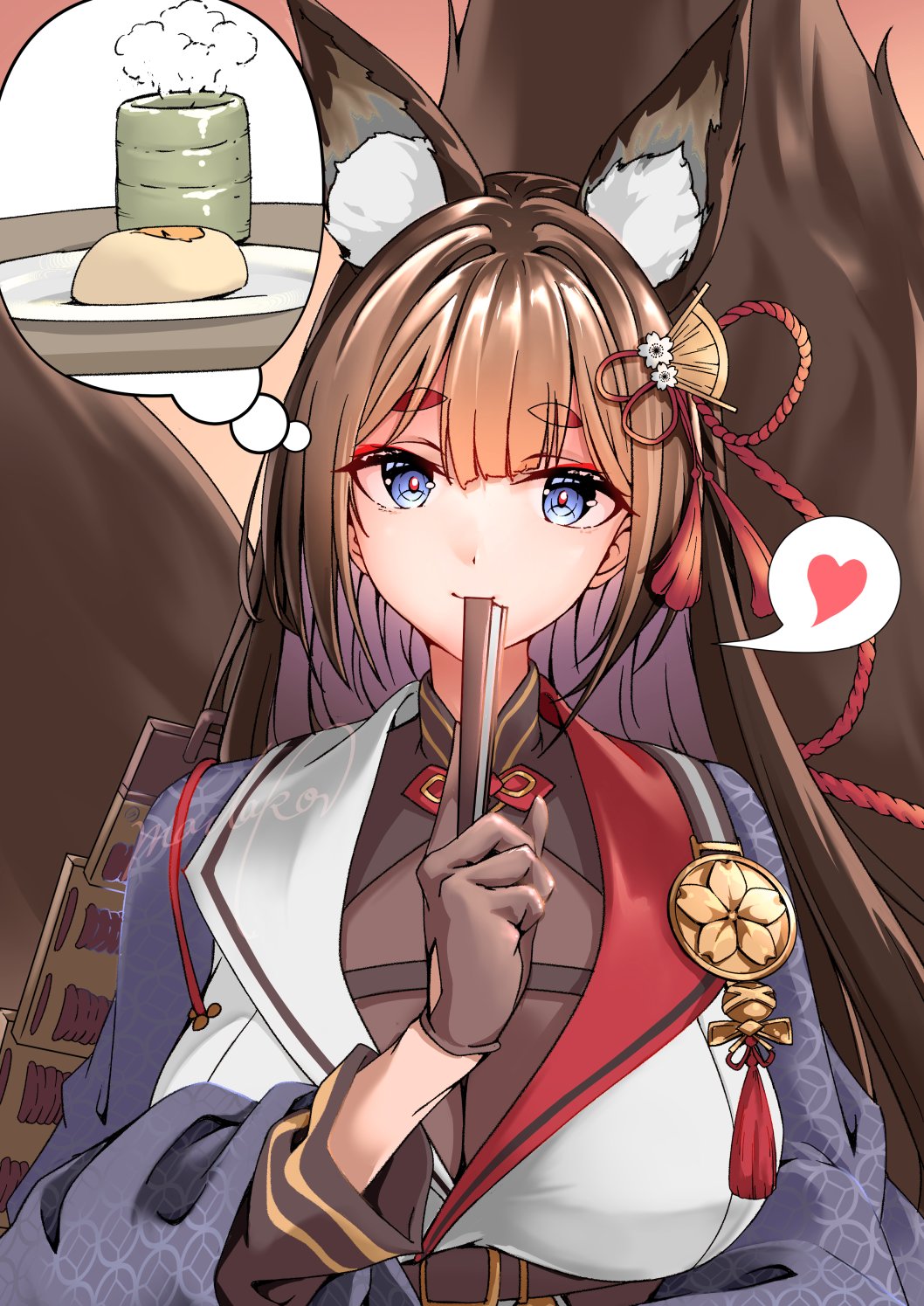 1girl amagi_(azur_lane) amagi_(cv)_(azur_lane) animal_ear_fluff animal_ears azur_lane blue_eyes brown_hair closed_mouth eyeliner fox_ears fox_girl fox_tail hair_ornament hand_fan heart highres hikimayu looking_at_viewer madakov_kodima makeup red_eyeliner sakura_empire_(emblem) solo speech_bubble spoken_heart tail thought_bubble upper_body
