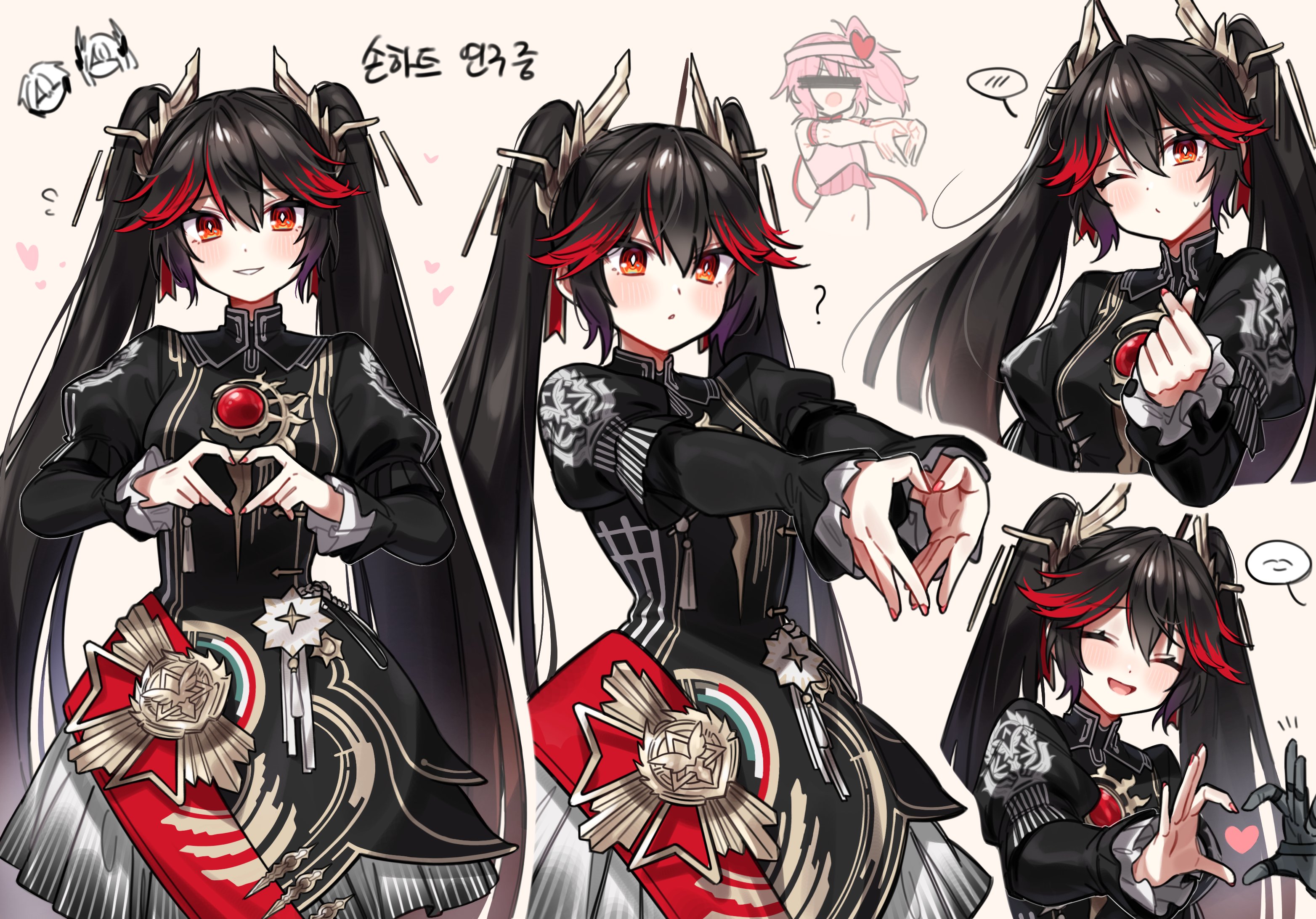 1boy 3girls black_dress black_hair character_request dress hair_between_eyes hair_ornament heart heart_hands highres jewelry lee_(pgr) liv_(pgr) long_hair long_sleeves lucia:_pyroath_(pgr) lucia_(pgr) multicolored_hair multiple_girls myam_(123ab456c) one_eye_closed punishing:_gray_raven red_eyes red_hair sidelocks streaked_hair twintails very_long_hair wing_hair_ornament