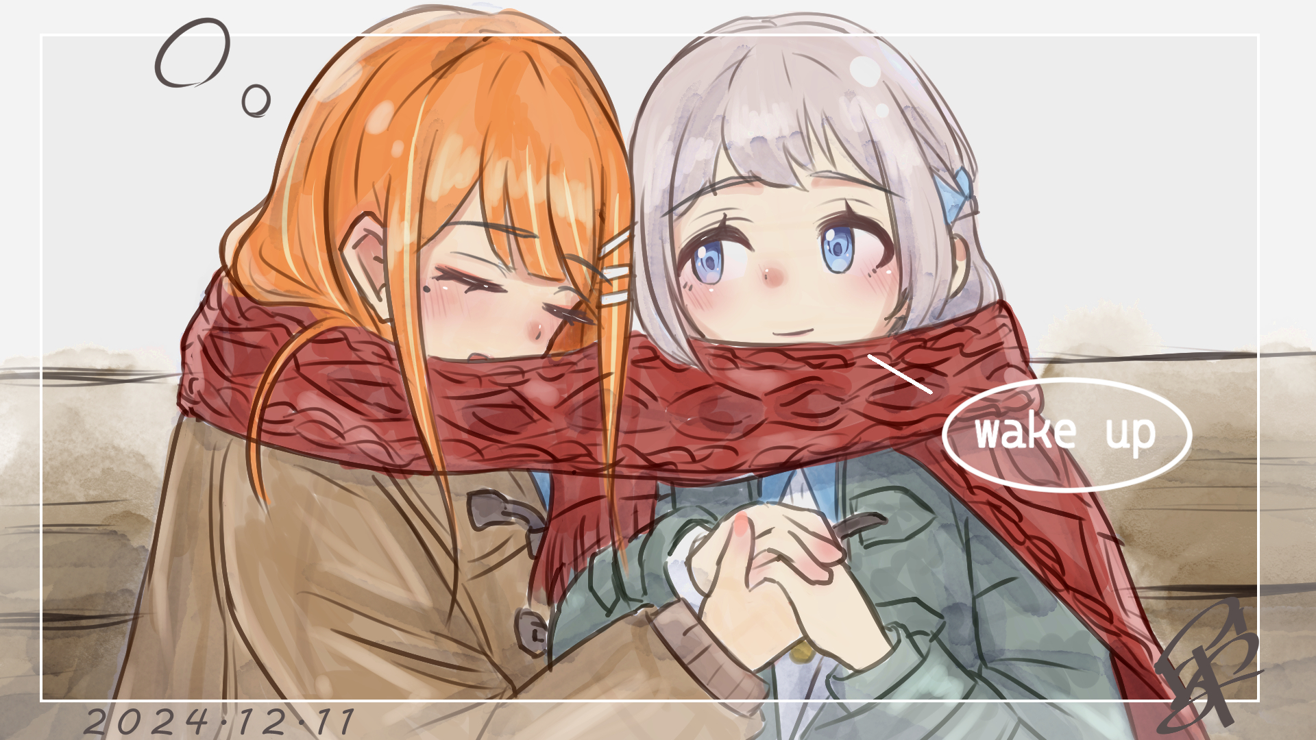 2girls blue_ribbon blush braid brown_coat coat dated duffel_coat gakuen_idolmaster grey_coat grey_hair hair_ribbon half_up_braid highres holding_hands idolmaster katsuragi_lilja knit_scarf looking_at_another mole mole_under_eye multiple_girls orange_hair red_scarf ribbon ribbon_braid rutomiartdayo scarf shared_clothes shared_scarf shiun_sumika sleeping squeans yuri