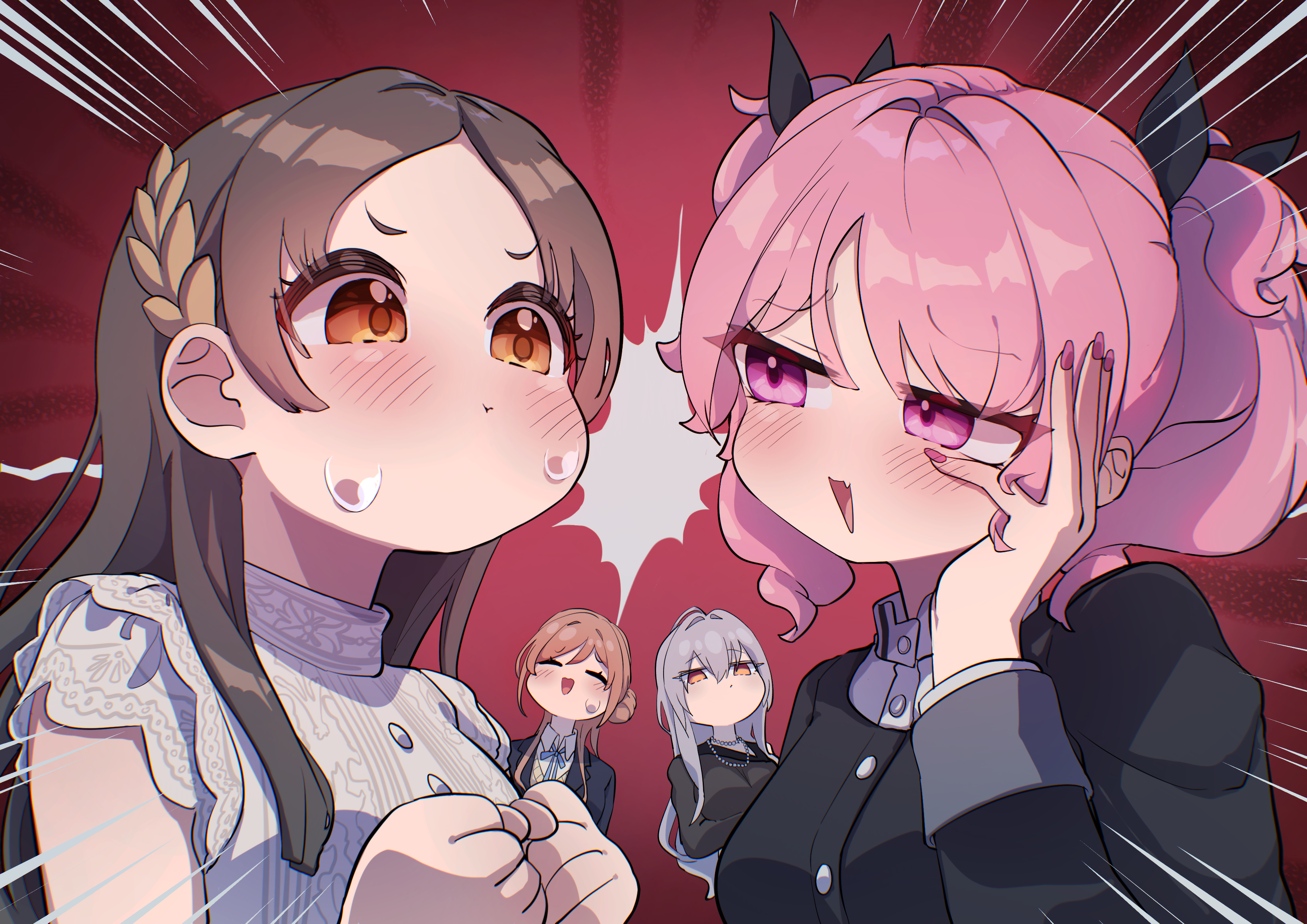 4girls :t ^_^ absurdres aoi_nadeshiko black_jacket blush brown_hair c_civciv clenched_hands closed_eyes fingernails gakuen_idolmaster gokugetsu_gakuen_school_uniform hand_on_own_cheek hand_on_own_face hatsuboshi_gakuen_school_uniform highres himesaki_rinami idolmaster jacket kuramoto_china multiple_girls nail_polish nervous_sweating pout school_uniform shirakusa_gekka shirt sweat twintails upper_body white_shirt