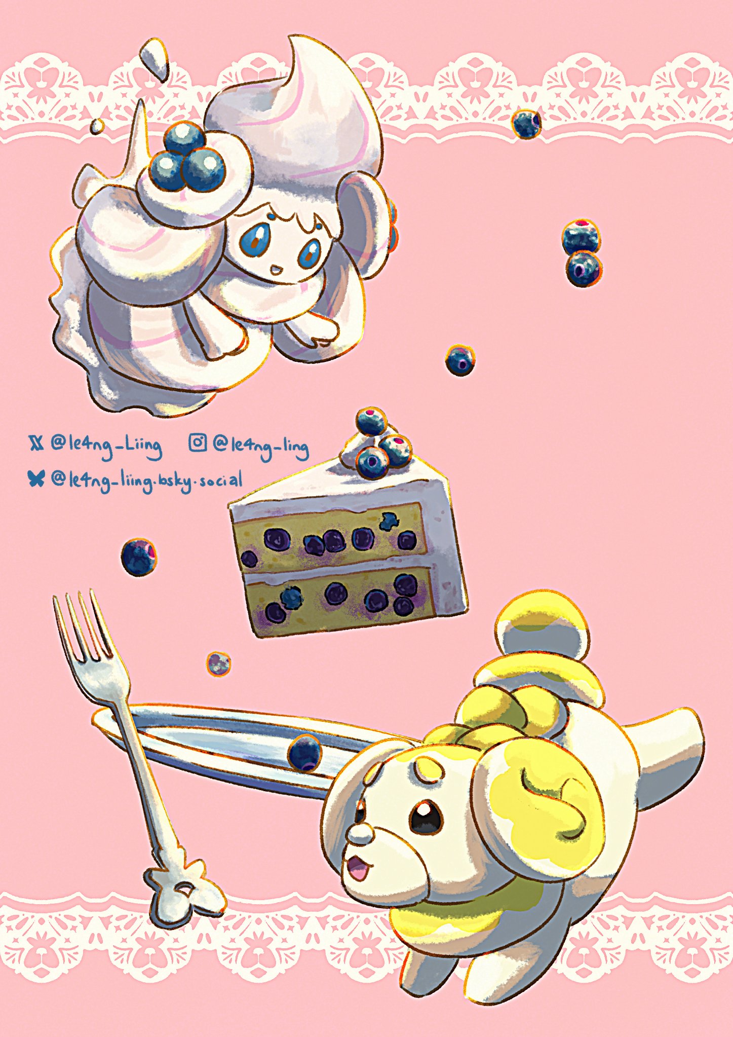 :d alcremie blue_eyes bluesky_logo bluesky_username cake cake_slice commentary_request fidough food fork gen_8_pokemon happy highres instagram_logo instagram_username le4ng_liing nintendo no_humans open_mouth pink_background plate pokemon pokemon_(creature) red_pupils smile twitter_username twitter_x_logo