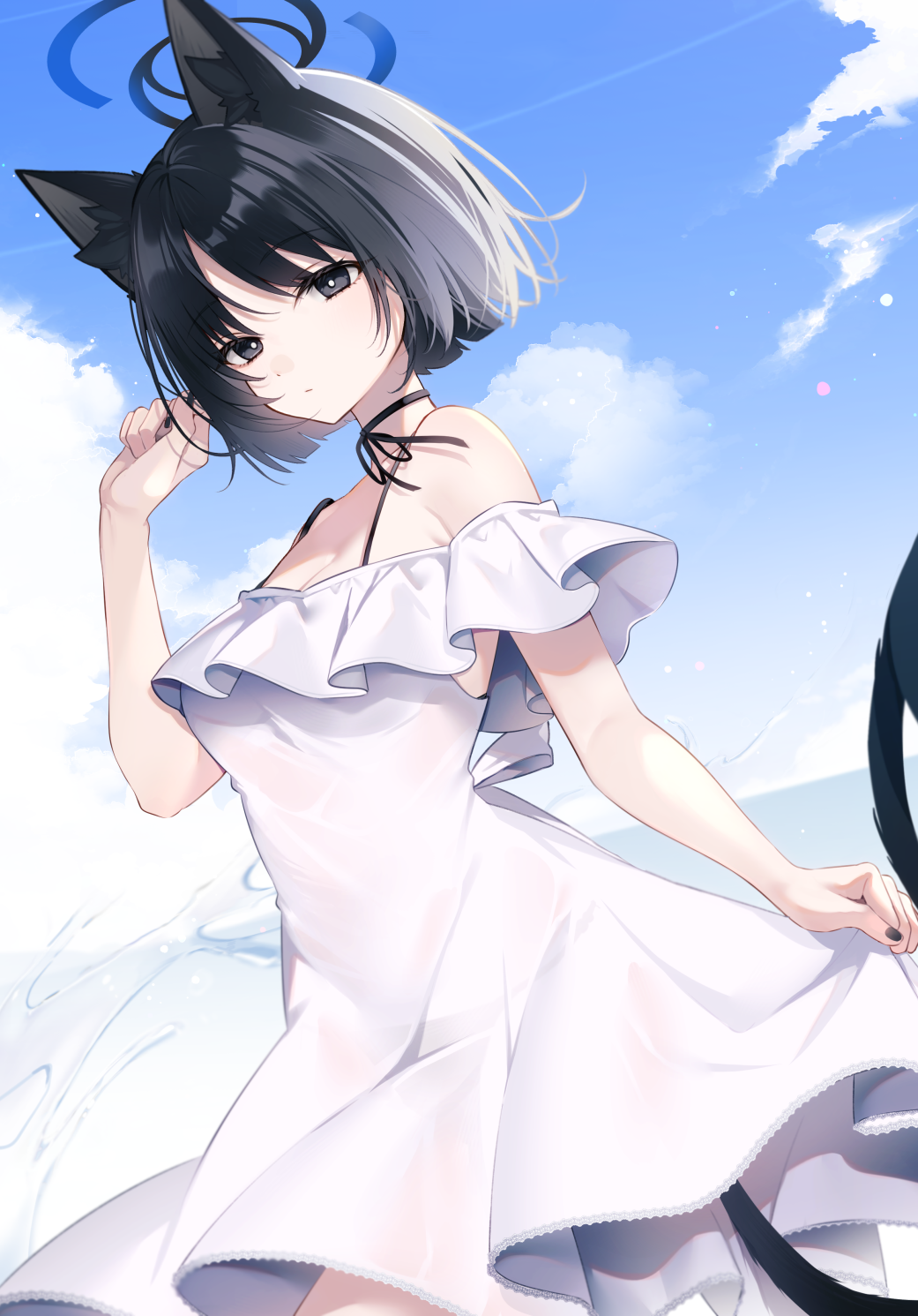 animal_ears bakeneko black_eyes black_hair black_nails black_ribbon blue_archive bright_pupils cat_ears cat_tail choker commentary_request cowboy_shot dress halo highres holding_own_dress kikyou_(blue_archive) nail_polish nekomata off_shoulder outdoors ribbon ribbon_choker sasakichi_(ssk_chi) short_hair sky tail water white_dress white_pupils