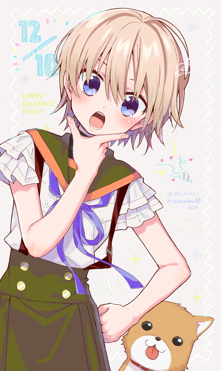 1girl animal_ears birthday blue_eyes blue_ribbon chiba_sadoru dog_ears gakkou_gurashi! green_skirt hand_on_own_chin hand_on_own_hip happy_birthday highres looking_at_viewer megurigaoka_high_school_uniform naoki_miki neck_ribbon open_mouth ribbon school_uniform shirt short_hair short_sleeves skirt suspender_skirt suspenders taroumaru_(gakkou_gurashi) tongue tongue_out white_hair white_shirt