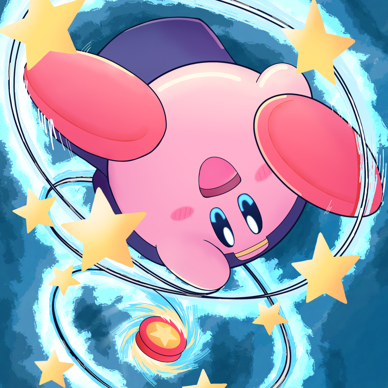 backwards_hat baseball_cap blue_background hat highres kirby kirby_(series) nintendo no_humans open_mouth smile solo star_(symbol) suparna0217 upside-down yo-yo