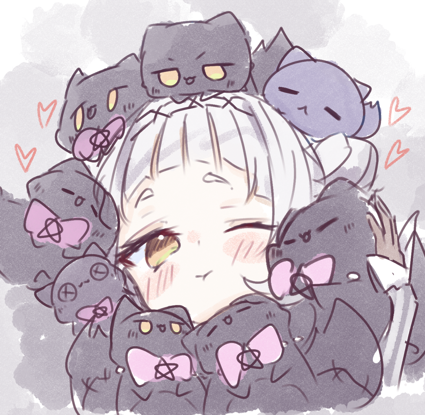 1girl :t ao_growth_20 arched_bangs blush_stickers creature grey_hair hairband heart highres holding holding_creature hololive murasaki_shion shiokko_(murasaki_shion) short_eyebrows virtual_youtuber watercolor_effect yellow_eyes