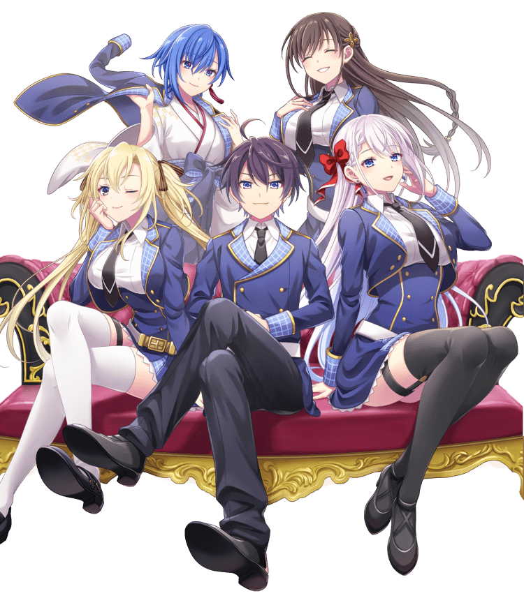 1boy 4girls belt black_footwear black_pants black_thighhighs blonde_hair blue_eyes blue_hair blush breasts brown_hair closed_eyes closed_mouth couch elfine_phillet excalibur_academy_school_uniform formal_clothes full_body grin hair_between_eyes jacket large_breasts leonis_death_magnus long_hair looking_at_viewer medium_breasts multiple_girls official_art on_couch one_eye_closed open_mouth pants regina_mercedes riselia_ray_crystalia sakuya_sieglinde seiken_gakuin_no_maken_tsukai shoes simple_background sitting smile straight-on suit teeth thighhighs transparent_background white_belt white_thighhighs zettai_ryouiki