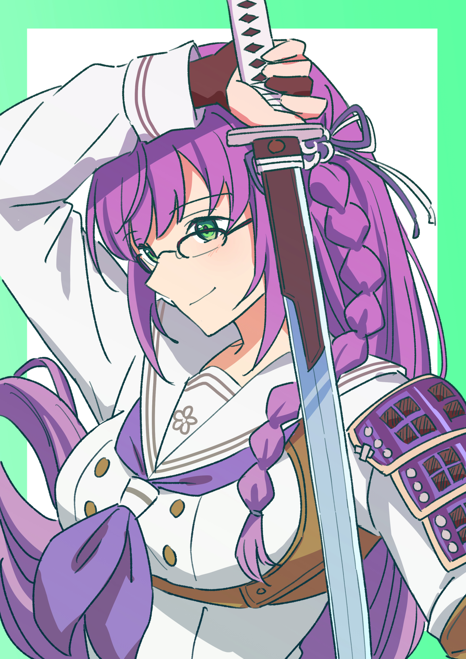 1girl armor black-framed_eyewear border braid breasts buttons closed_mouth commentary_request cosplay double-breasted glasses green_border green_eyes hair_ribbon highres holding holding_sword holding_weapon japanese_armor katana kote kujo_kaede kujo_kaede_(cosplay) large_breasts link!_like!_love_live! long_braid long_hair love_live! neckerchief nogreen official_alternate_costume ongeki otomune_kozue outside_border over-rim_eyewear purple_hair purple_neckerchief purple_ribbon ribbon sailor_collar school_uniform semi-rimless_eyewear serafuku shirt shoulder_armor side_braid sidelocks sideways_mouth smile sode solo sword underbust upper_body virtual_youtuber weapon white_background white_ribbon white_sailor_collar white_serafuku white_shirt