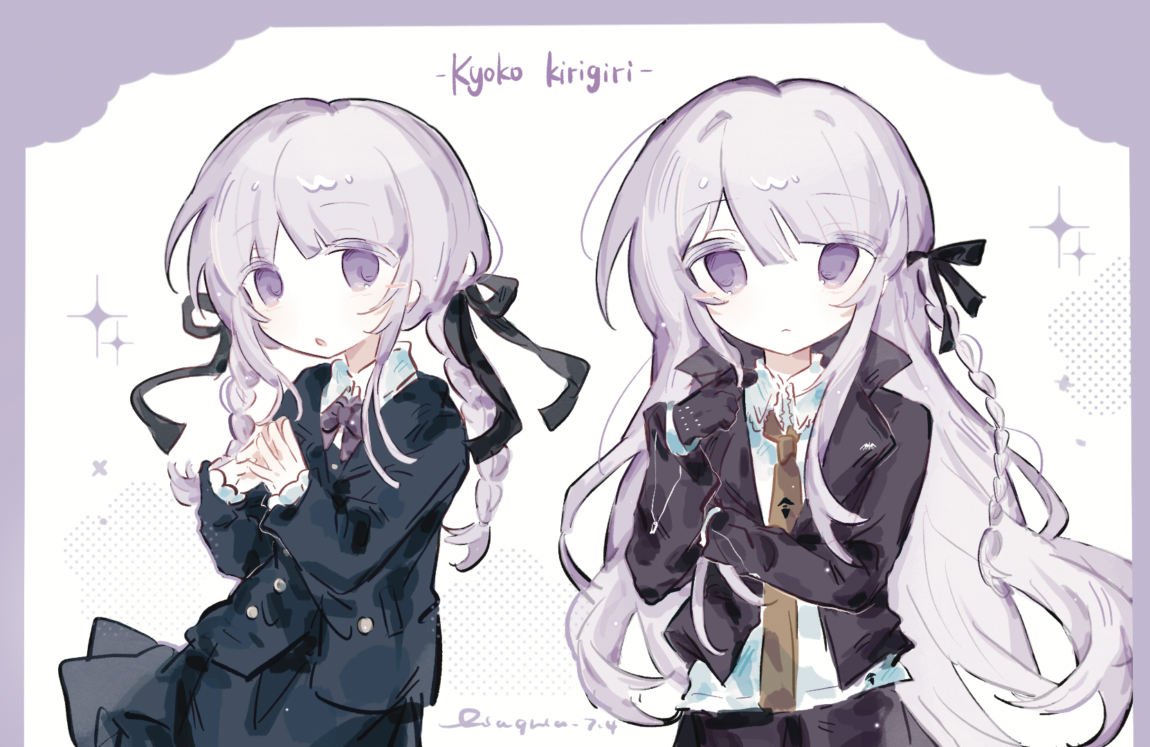 1girl black_gloves black_jacket black_ribbon black_skirt blunt_bangs blush_stickers border bow bowtie braid brown_necktie buttons character_name chinese_commentary closed_mouth collared_jacket collared_shirt commentary_request danganronpa danganronpa:_trigger_happy_havoc danganronpa_(series) danganronpa_kirigiri expressionless fen_mao_yanjing_chu frilled_shirt_collar frills gloves hair_ribbon hand_on_own_arm highres jacket kirigiri_kyoko lapel_pin lapels layered_sleeves light_blush light_frown long_hair long_sleeves miniskirt necktie notched_lapels open_clothes open_jacket pleated_skirt purple_border purple_bow purple_bowtie purple_eyes purple_hair purple_jacket purple_skirt ribbon shirt sidelocks single_blush_sticker single_braid skirt sparkle standing studded_gloves time_paradox twin_braids very_long_hair white_background white_shirt