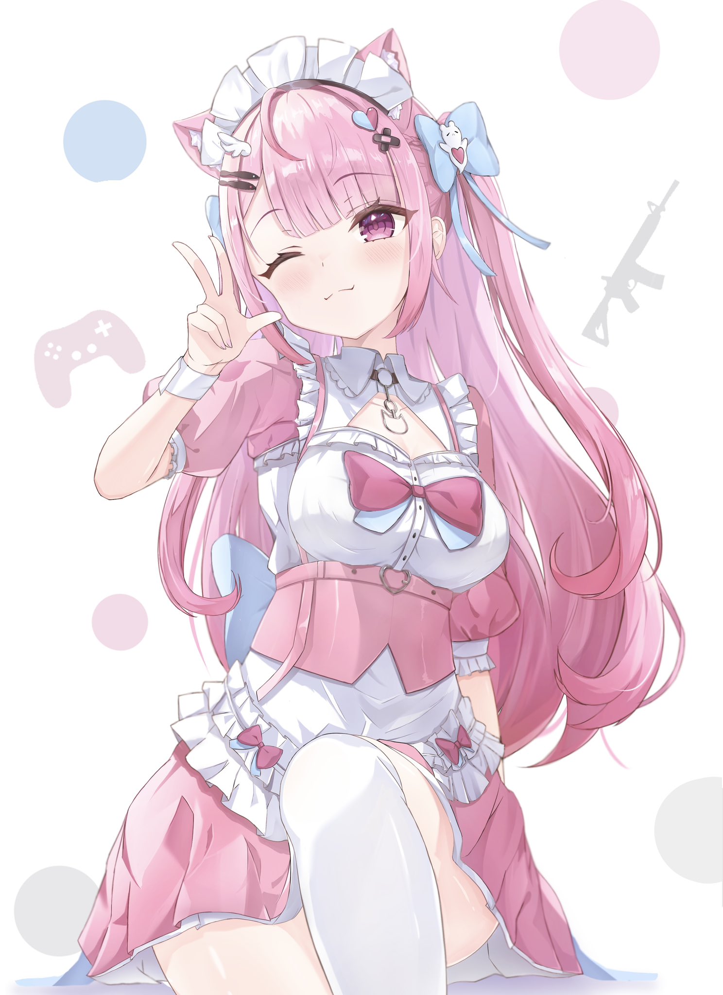 1girl :3 ahoge animal_ear_fluff animal_ears animal_print apron ar-15 arm_at_side bandaid bandaid_hair_ornament belt black_choker blue_bow bow breasts buttons cat_choker cat_ears cat_girl cat_print choker cleavage cleavage_cutout closed_mouth clothing_cutout collared_dress controller dot_nose dress fish_hair_ornament frilled_apron frilled_dress frilled_sleeves frills game_controller ghost_hair_ornament gun hair_bow hair_ornament hand_up heart heart_belt heart_belt_buckle heart_hair_ornament highres indie_virtual_youtuber knee_up kneehighs light_smile long_hair looking_at_viewer maid maid_apron maid_headdress medium_breasts multicolored_bow o-ring o-ring_choker one_eye_closed petticoat pink_belt pink_bow pink_dress pink_eyes pink_hair puffy_short_sleeves puffy_sleeves rifle short_sleeves silhouette simple_background sitting socks solo straight_hair two_side_up unconventional_maid underbust uneti_1 v virtual_youtuber waist_apron weapon white_apron white_background white_socks white_wrist_cuffs wing_hair_ornament wrist_cuffs yuuki_sakuna yuuki_sakuna_(1st_costume)