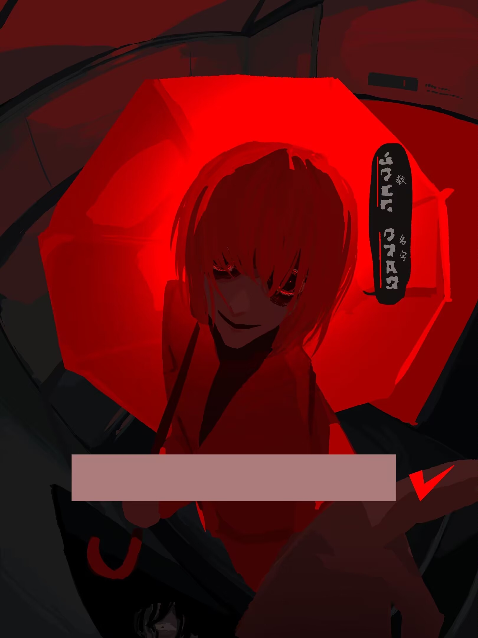 1boy bilingual_text chinese_commentary chinese_text coat commentary_request dilated_pupils fake_screenshot from_above highres holding holding_umbrella homicipher homicipher_text indoors looking_at_viewer male_focus mixed-language_text mr._scarletella no_lineart procreate_(medium) reaching reaching_towards_viewer red_background red_coat red_eyes red_hair red_theme red_umbrella shiwen50844 short_hair solo translation_request umbrella