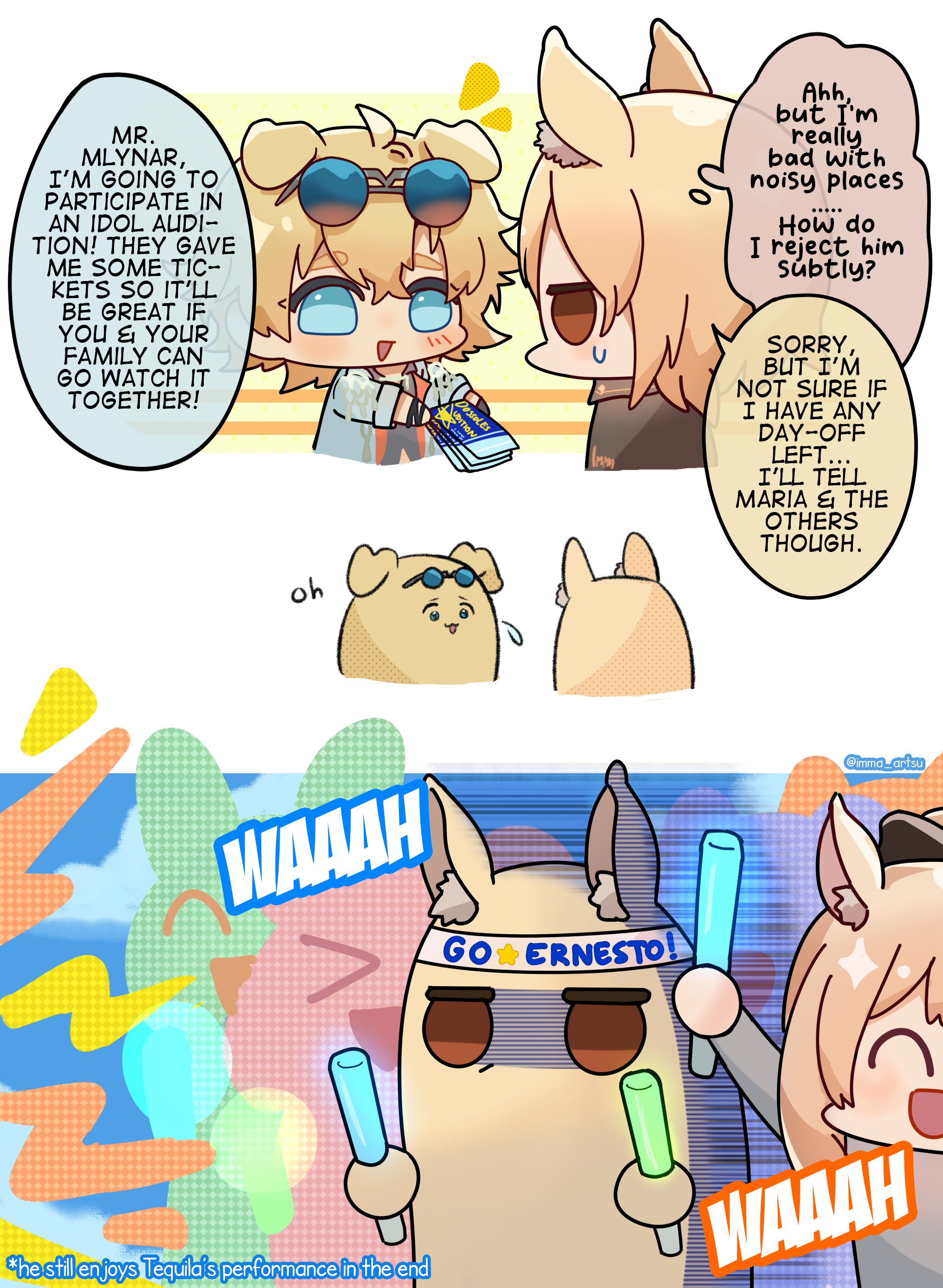 absurdres animal_ears black_shirt blemishine_(arknights) blonde_hair blue_eyes blue_jacket brown_eyes chibi dog_boy dog_ears english_text eyewear_on_head highres imma_artsu jacket mlynar_(arknights) open_clothes open_jacket open_mouth shirt tequila_(arknights) tequila_(top_tier_live)_(arknights)