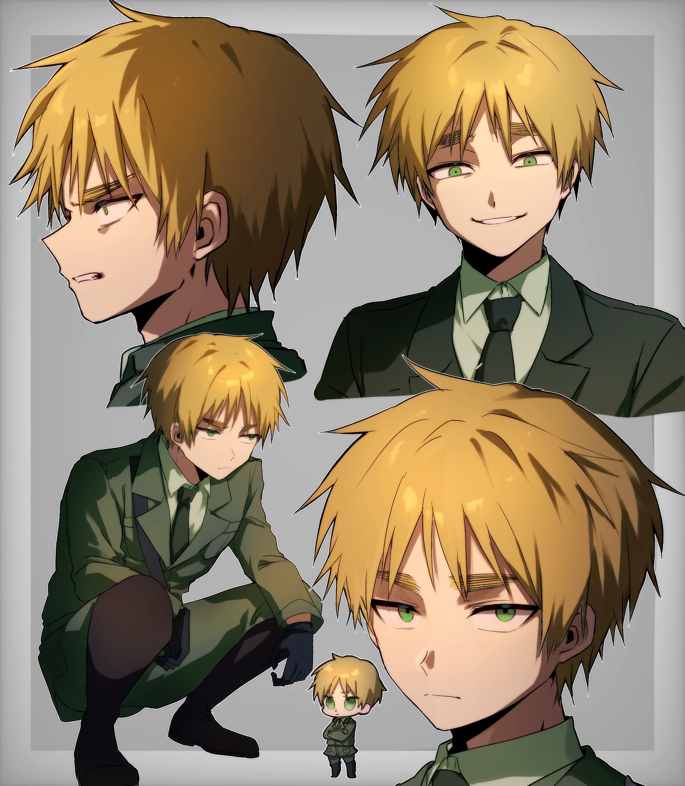 1boy absurdres axis_powers_hetalia belt black_belt black_footwear black_gloves blonde_hair boots border chibi chibi_inset closed_mouth collared_shirt crossed_arms full_body gloves green_eyes green_jacket green_necktie green_pants grey_background grey_border highres htkehey jacket lapels long_sleeves looking_afar looking_at_viewer male_focus military_jacket necktie outside_border pants pocket shirt short_hair simple_background smile standing teeth united_kingdom_(hetalia) upper_body white_shirt