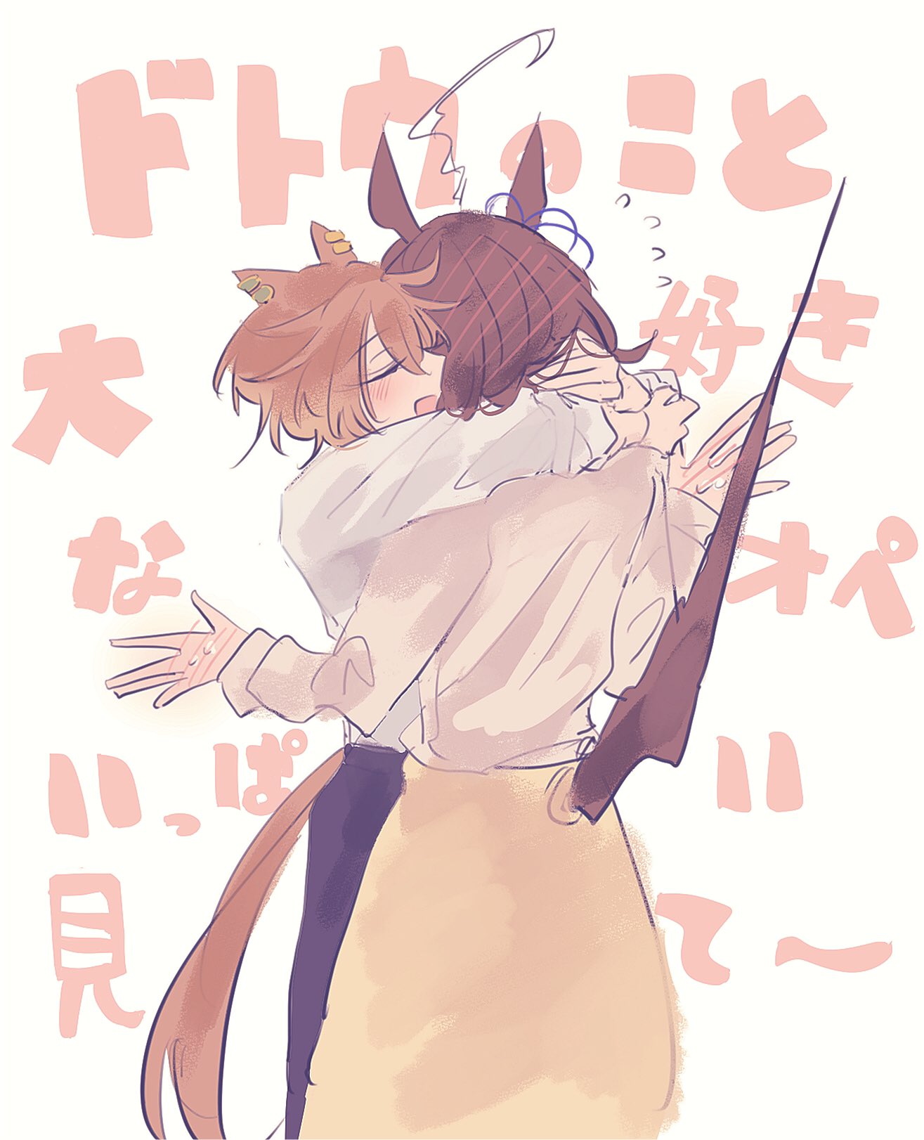 2girls ahoge animal_ears arms_around_neck blush bow brown_hair brown_tail closed_eyes clothing_cutout commentary ear_ornament ear_ribbon flying_sweatdrops hair_between_eyes hand_blush hand_on_another's_neck hands_up heads_together highres horse_ears horse_girl horse_tail hug long_sleeves meisho_doto_(umamusume) multicolored_hair multiple_girls open_mouth pants samekun_(samekun_s) shirt short_hair skirt standing stiff_tail streaked_hair surprised sweat t.m._opera_o_(umamusume) tail tail_through_clothes text_background translation_request umamusume white_hair white_shirt yellow_skirt