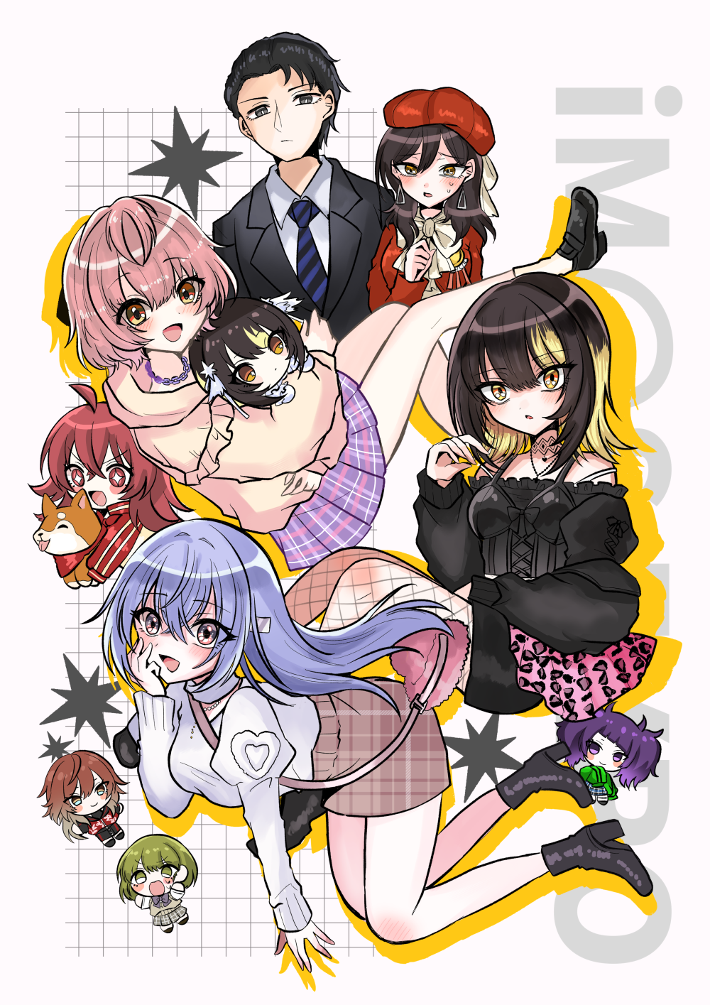 1boy 6+girls aketa_mikoto amai_tsutomu black_hair blonde_hair blue_hair blush character_doll chibi chibi_inset cometik_(idolmaster) commentary_request doll grid_background highres hugging_doll hugging_object idolmaster idolmaster_shiny_colors ikaruga_luca ikuta_haruki komiya_kaho mamemaru_(shiny_colors) mimoe mother_and_child mother_and_daughter multicolored_hair multiple_girls nanakusa_nichika parent_and_child pink_hair smile streaked_hair suzuki_hana tanaka_mamimi two-tone_hair yakumo_nami