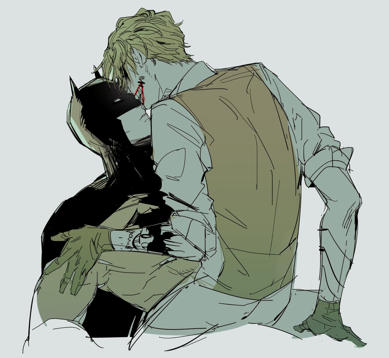 2boys aesjmhi5 arm_support batman batman_(series) black_gloves closed_mouth collared_shirt commentary_request dc_comics eye_contact gloves grin highres korean_commentary looking_at_another male_focus multiple_boys shirt short_hair simple_background sitting sitting_on_lap sitting_on_person sketch sleeve_cuffs sleeves_rolled_up smile superhero_costume teeth the_joker vest white_background white_shirt yaoi