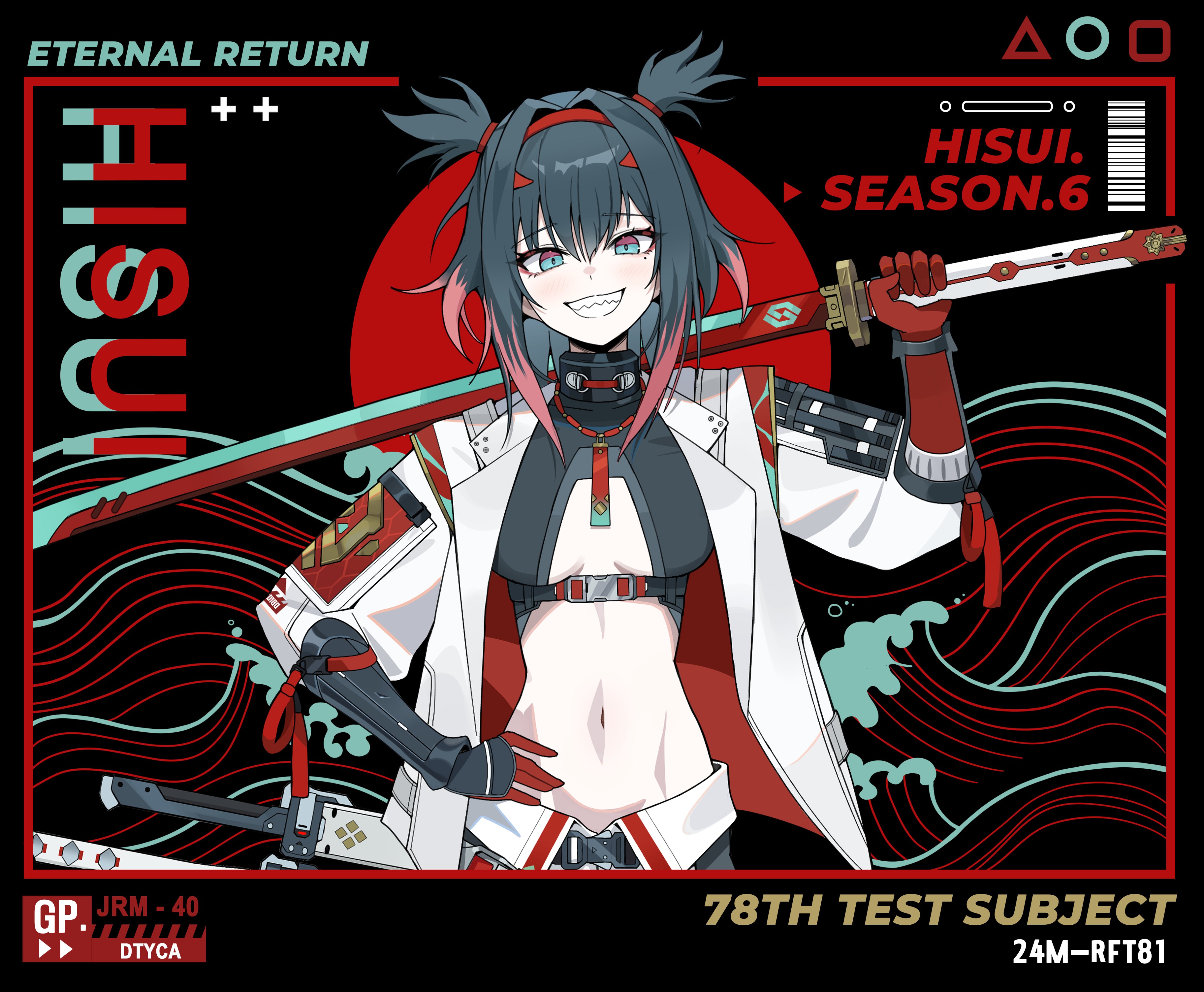 1girl absurdres armor black_hair black_survival breast_cutouts breasts character_name coat dalgam12 eternal_return:_black_survival evil_grin evil_smile eyelashes gloves grin hair_between_eyes highres hisui_(black_survival) holding holding_sword holding_weapon japanese_armor katana mole mole_under_eye multicolored_eyes multicolored_hair multiple_swords navel pink_eyes pink_hair slit_pupils smile solo stomach sword two-tone_hair weapon white_coat