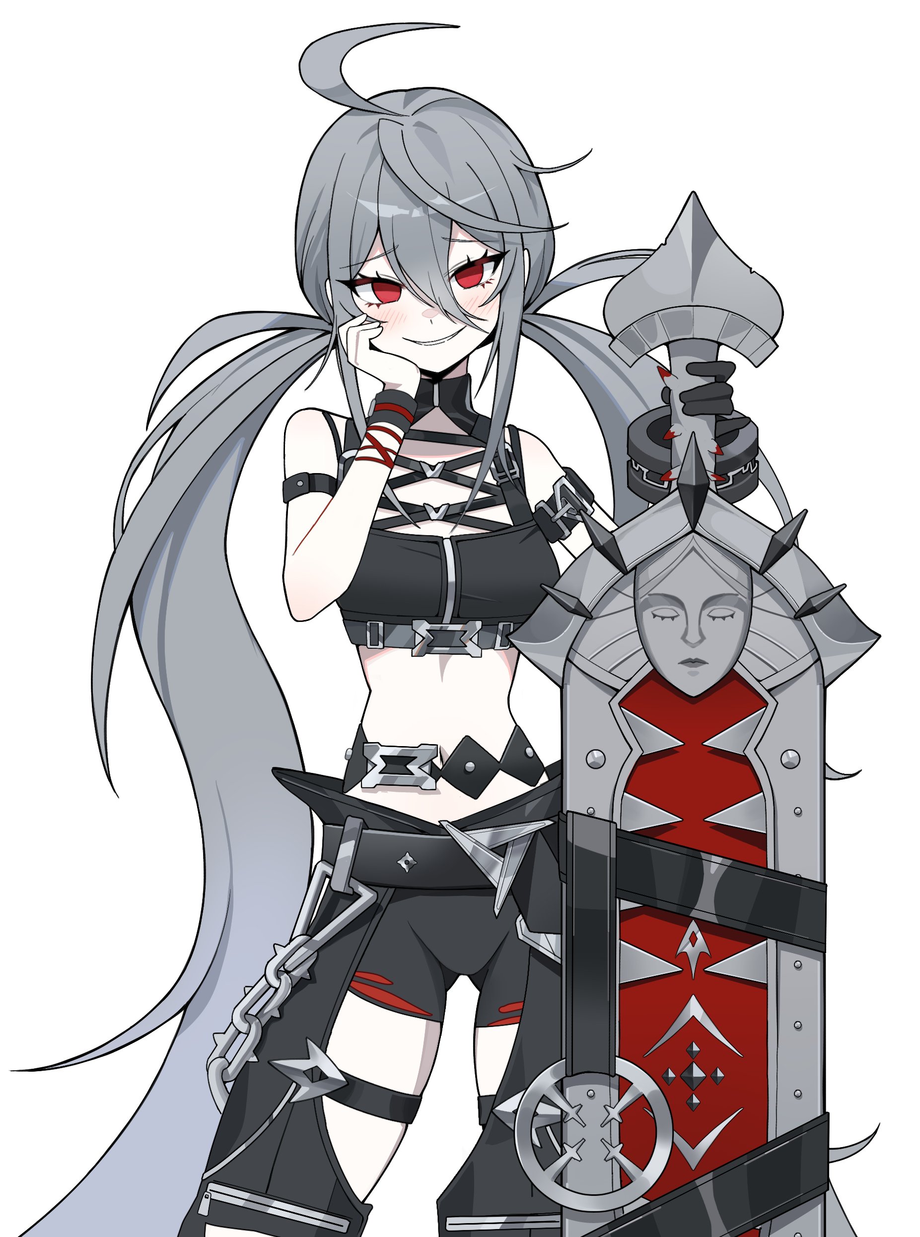 1girl absurdres ahoge arm_strap bare_shoulders belt black_pants black_shirt black_survival blush bra_strap breasts chain clothing_cutout crop_top dalgam12 eternal_return:_black_survival garnet_(black_survival) grey_hair hand_up highres holding holding_weapon long_hair looking_at_viewer loose_belt low_twintails midriff pants red_eyes shirt simple_background sleeveless sleeveless_shirt small_breasts smile solo standing stomach thigh_cutout thigh_strap thighs twintails very_long_hair weapon white_background wristband