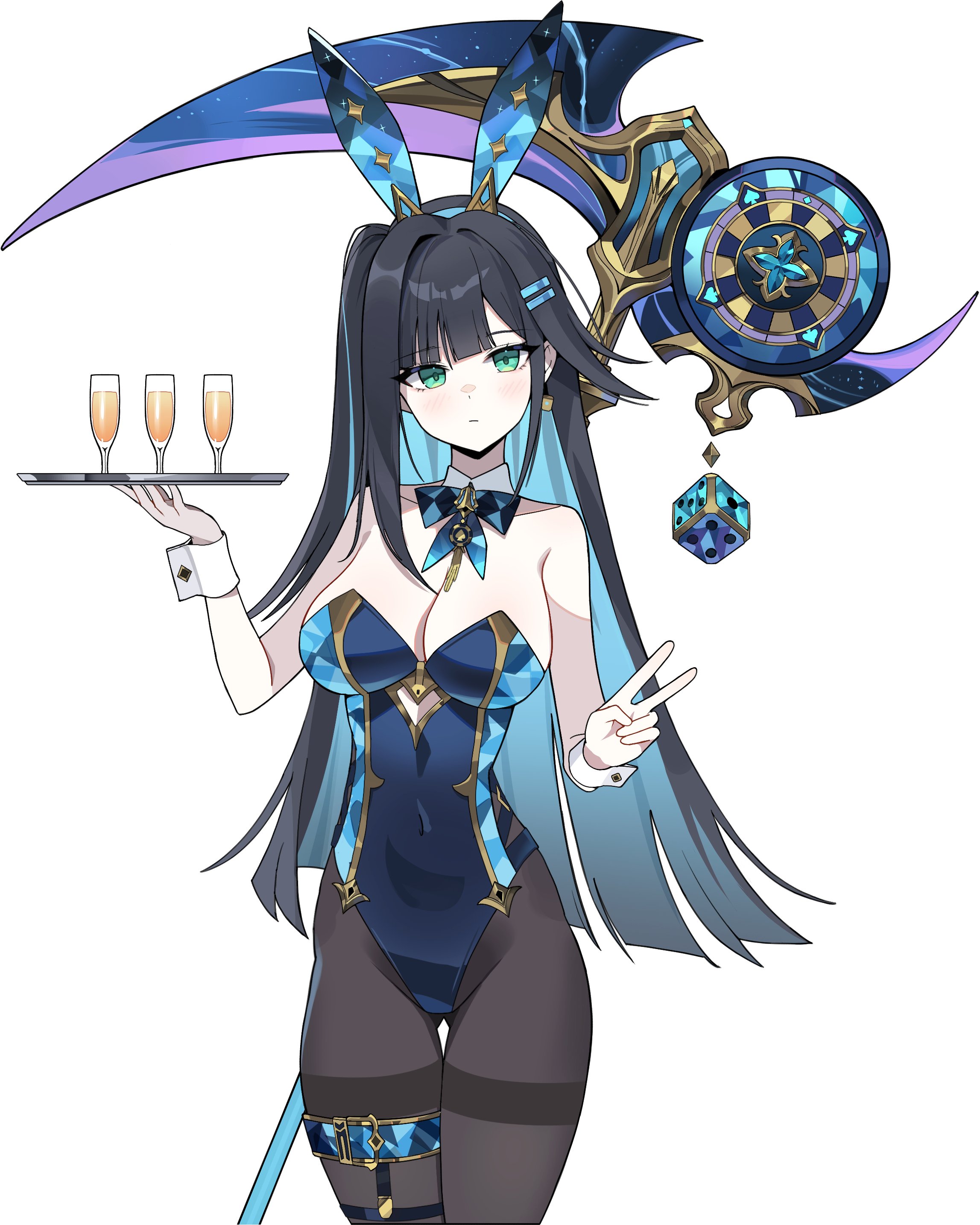 1girl abigail_(black_survival) abigail_(poker_face)_(black_survival) absurdres alcohol animal_ears bare_arms bare_shoulders belt black_hair black_leotard black_survival blue_bow blue_hair blue_hairband blue_leotard bow breasts champagne closed_mouth clothing_cutout colored_inner_hair cup cutout_above_navel dalgam12 dice eternal_return:_black_survival fake_animal_ears gold_trim green_eyes hair_intakes hair_ornament hairband hairclip hand_up highleg highleg_leotard highres holding holding_scythe large_breasts leotard long_hair looking_at_viewer multicolored_hair official_alternate_costume scythe v