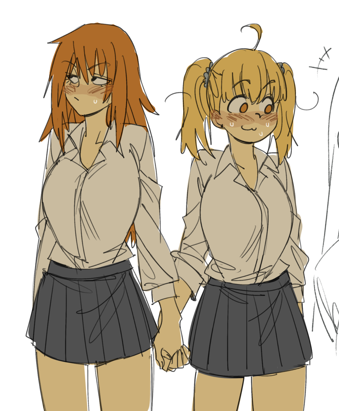 +++ 2girls :/ :3 ahoge averting_eyes black_eyes blonde_hair blush breasts brown_eyes brown_hair closed_mouth collared_shirt commentary cowboy_shot dress_shirt gamou_maki grey_skirt gutalalaman height_difference highres holding_hands ijiranaide_nagatoro-san interlocked_fingers large_breasts long_hair long_sleeves looking_down looking_up miniskirt multiple_girls nervous_sweating pleated_skirt school_uniform shirt shirt_tucked_in side-by-side simple_background skirt standing sweat twintails white_background white_shirt yoshi_(nagatoro) yuri