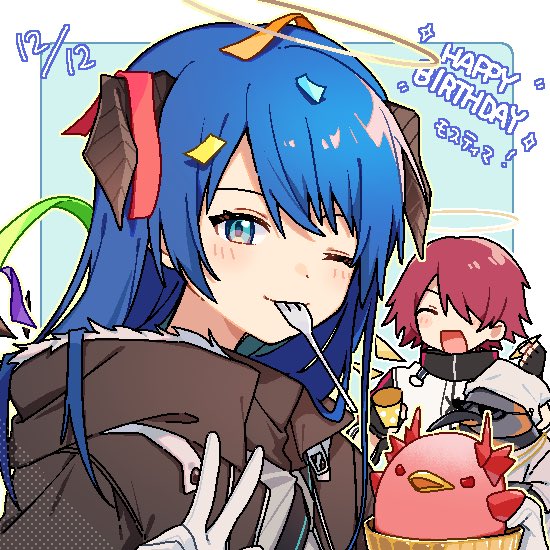 2girls :d ;) ^_^ arknights blue_eyes blue_hair brown_horns brown_jacket character_name closed_eyes closed_mouth commentary emperor_(arknights) exusiai_(arknights) fork fur_trim hair_over_one_eye halo happy_birthday horns jacket long_hair looking_at_viewer maguro_kan mostima_(arknights) mouth_hold multiple_girls oekaki one_eye_closed one_eye_covered open_mouth penguin_logistics_(arknights) pink_hair short_hair smile streamers sunglasses untranslatable_commentary w yellow_halo