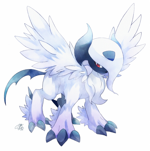 absol animal_focus bright_pupils claws commentary_request feathered_wings gen_3_pokemon inari_ina_(ayn0304) looking_back mega_absol mega_pokemon nintendo no_humans pokemon pokemon_(creature) red_eyes solo standing white_hair white_pupils wings