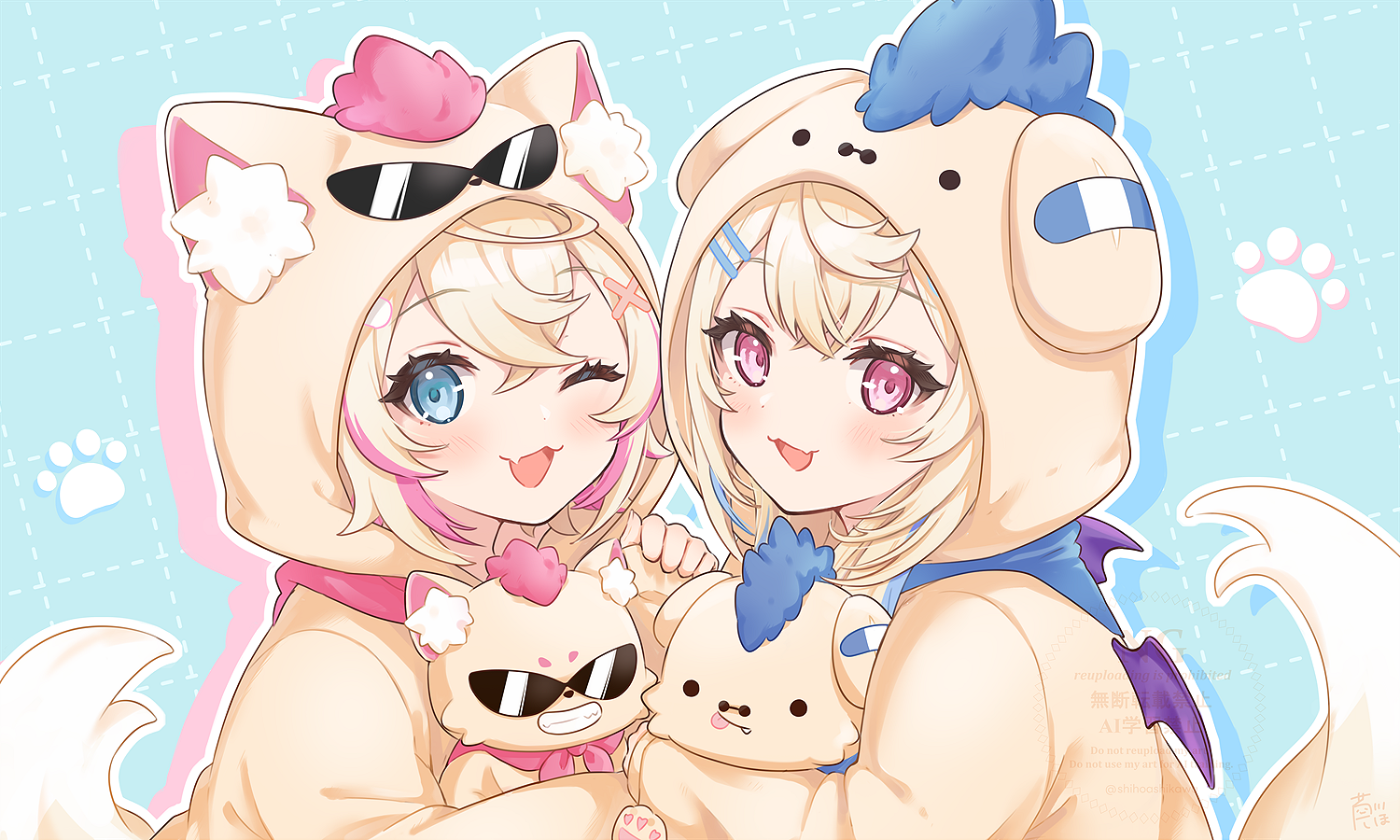 2girls alternate_costume animal_ear_fluff animal_ears animal_hood ashikawa_shiho bandaid bandaid_hair_ornament blonde_hair blue_hair blush dog_ears dog_girl dog_hood dog_tail fang fuwawa_abyssgard hair_ornament hairpin hololive hololive_english hood looking_at_viewer mococo_abyssgard multicolored_hair multiple_girls open_mouth pink_hair ruffian_(fuwamoco) skin_fang smile streaked_hair tail virtual_youtuber x_hair_ornament