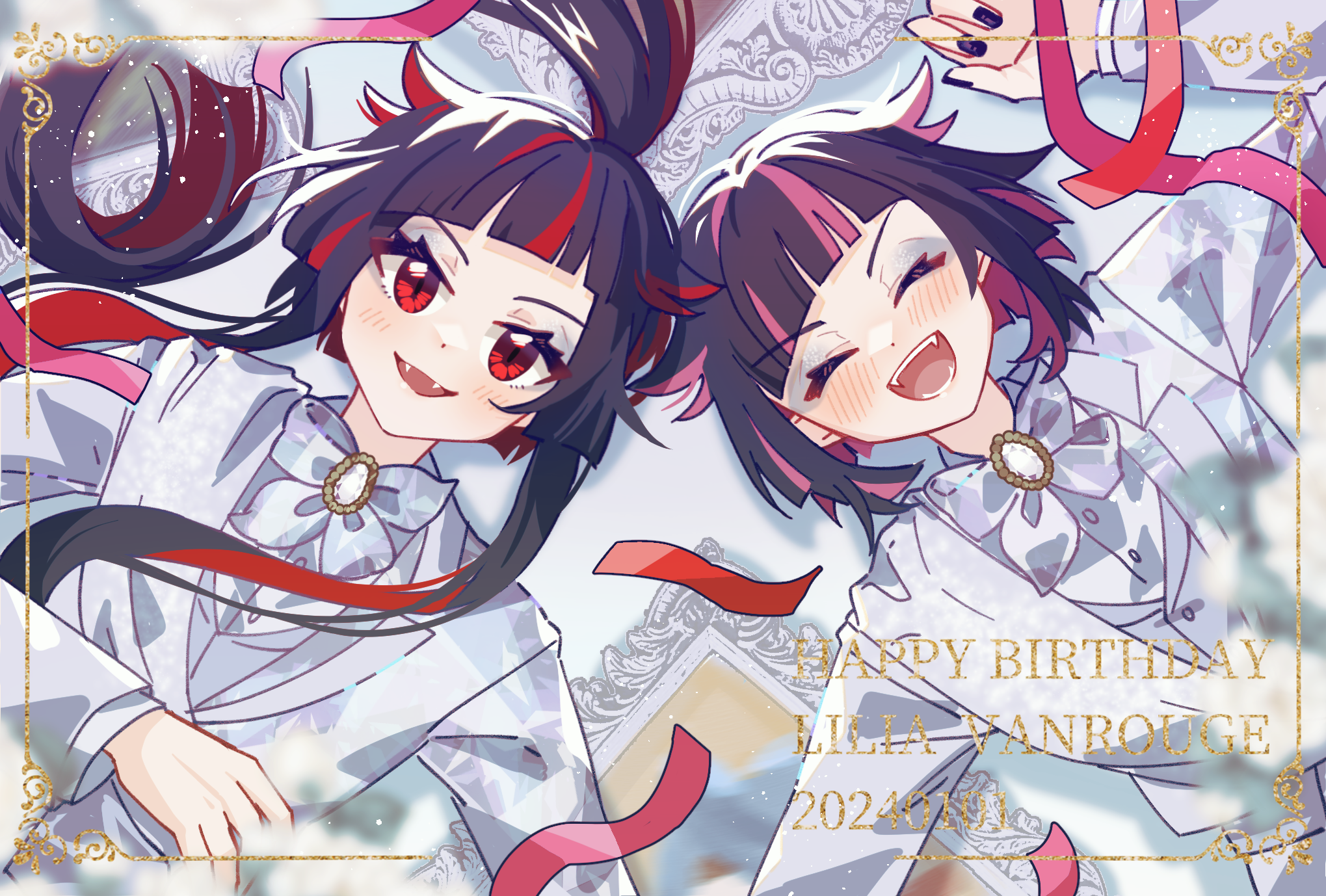 2boys :d ^_^ black_hair black_nails blunt_bangs brooch character_name chinese_commentary closed_eyes commentary_request confetti dated dual_persona eyeshadow fangs from_above gem grey_eyeshadow grey_jacket grey_vest hair_flaps happy_birthday highres jacket jewelry lilia_vanrouge lilia_vanrouge_(general's_armor) long_hair long_sleeves looking_at_viewer lying makeup male_focus multicolored_hair multiple_boys on_back open_mouth picture_frame pink_hair ponytail red_eyes red_hair riko_shinkai shirt short_hair smile streaked_hair twisted_wonderland upper_body vest white_gem white_shirt