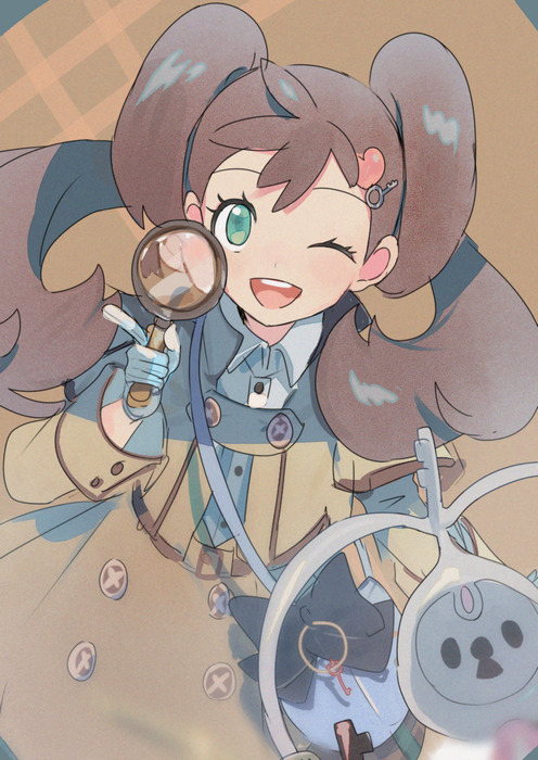 1girl ;d brown_hair buttons collared_shirt commentary_request eyelashes gen_6_pokemon gloves green_eyes hand_up holding holding_magnifying_glass klefki long_hair long_sleeves magnifying_glass mxkjxm_(nhss2337) nintendo official_alternate_costume one_eye_closed open_mouth pokemon pokemon_(creature) pokemon_masters_ex shauna_(pokemon) shauna_(special_costume)_(pokemon) shirt smile teeth twintails upper_teeth_only white_gloves white_shirt