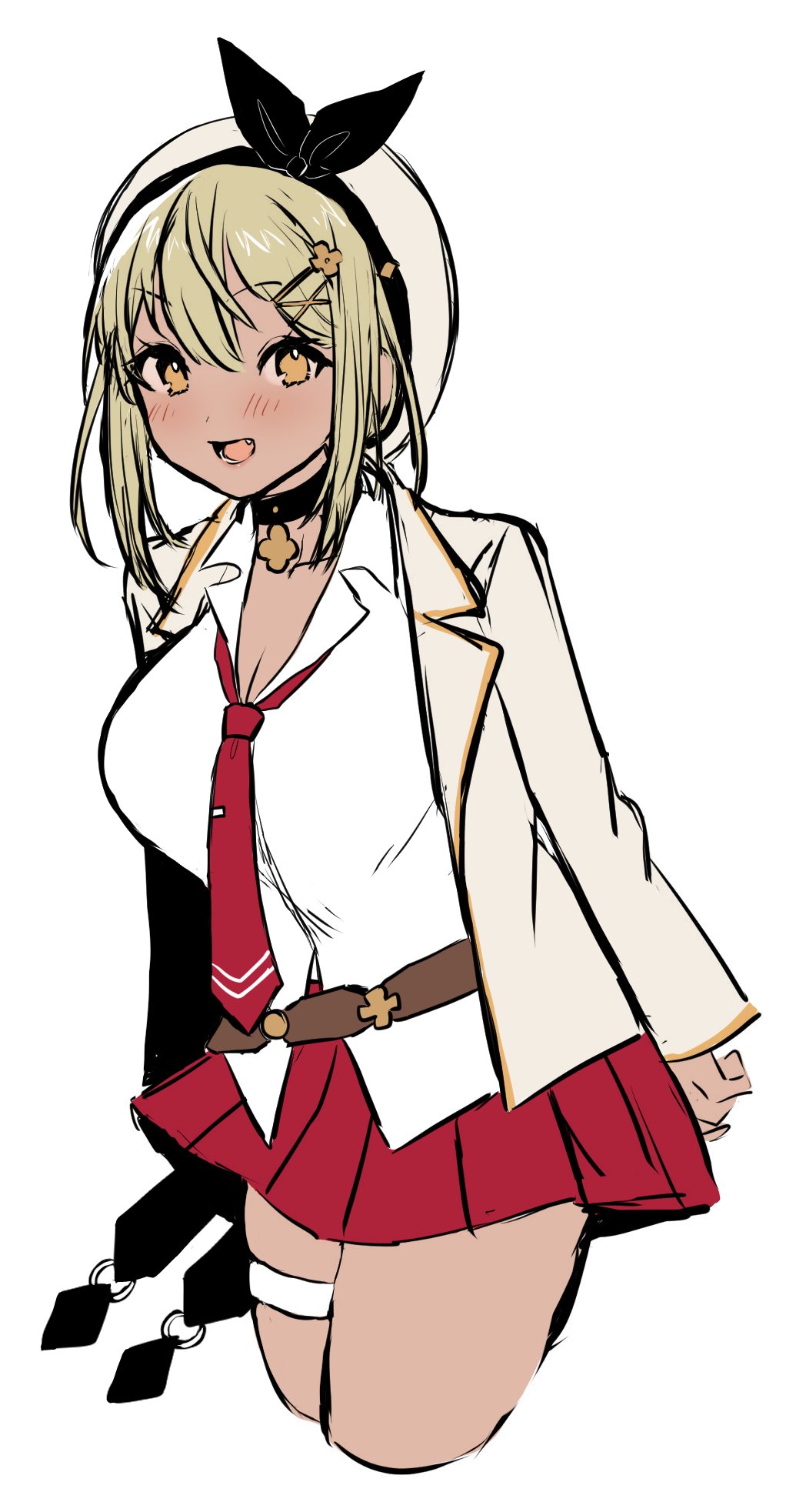 1girl :d alternate_costume atelier_(series) atelier_resleriana atelier_ryza belt blonde_hair blush breasts brown_eyes choker cleavage collared_shirt commentary cropped_legs dark-skinned_female dark_skin fang gyaru hair_ornament hairclip hat highres jacket kaninoko large_breasts looking_at_viewer miniskirt necktie open_clothes open_jacket open_mouth pleated_skirt red_necktie red_skirt reisalin_stout reisalin_stout_(blooming_energy) shirt short_hair simple_background sketch skirt smile solo thigh_strap thighs white_background white_jacket white_shirt