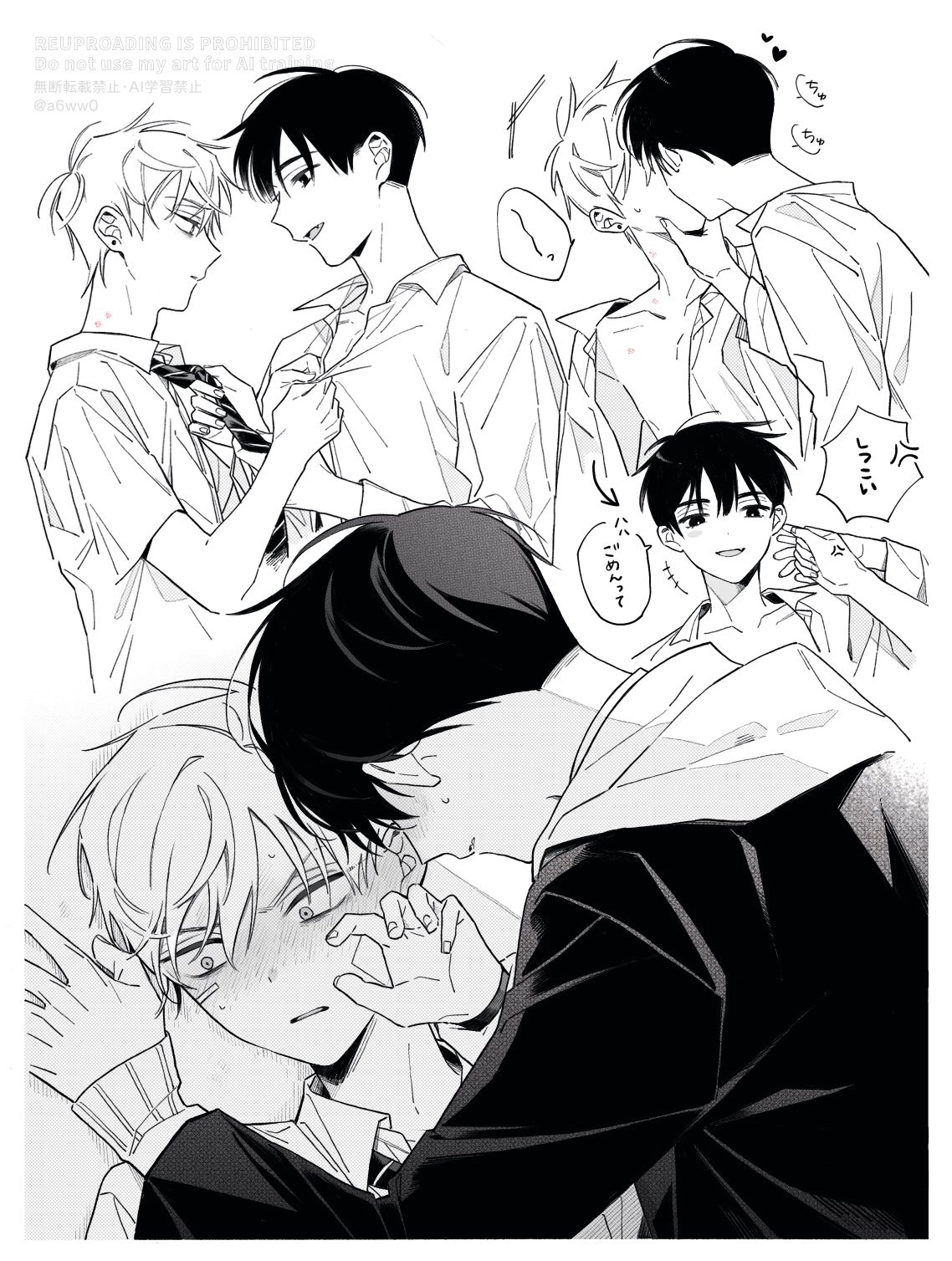 2boys a6ww0 alien_stage blush clothes_grab collared_shirt commentary fang greyscale heart highres ivan_(alien_stage) jacket kiss long_sleeves male_focus monochrome multiple_boys necktie necktie_grab neckwear_grab open_mouth shirt grabbing_another's_shirt short_hair short_sleeves smile till_(alien_stage) yaoi